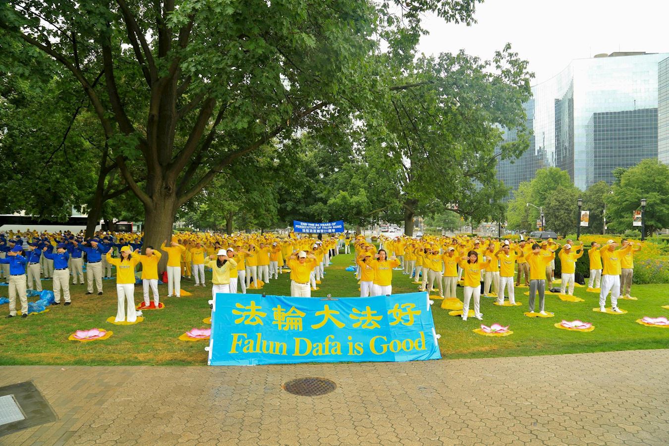 早上九点开始,来自加拿大部分学员和多伦多学员在省议会大楼前的皇后公园集体炼功,期间倾盆大雨近两小时,学员们在雨中一直坚持不懈。一直到中午十二点开始集会,天空也转为晴天了。
