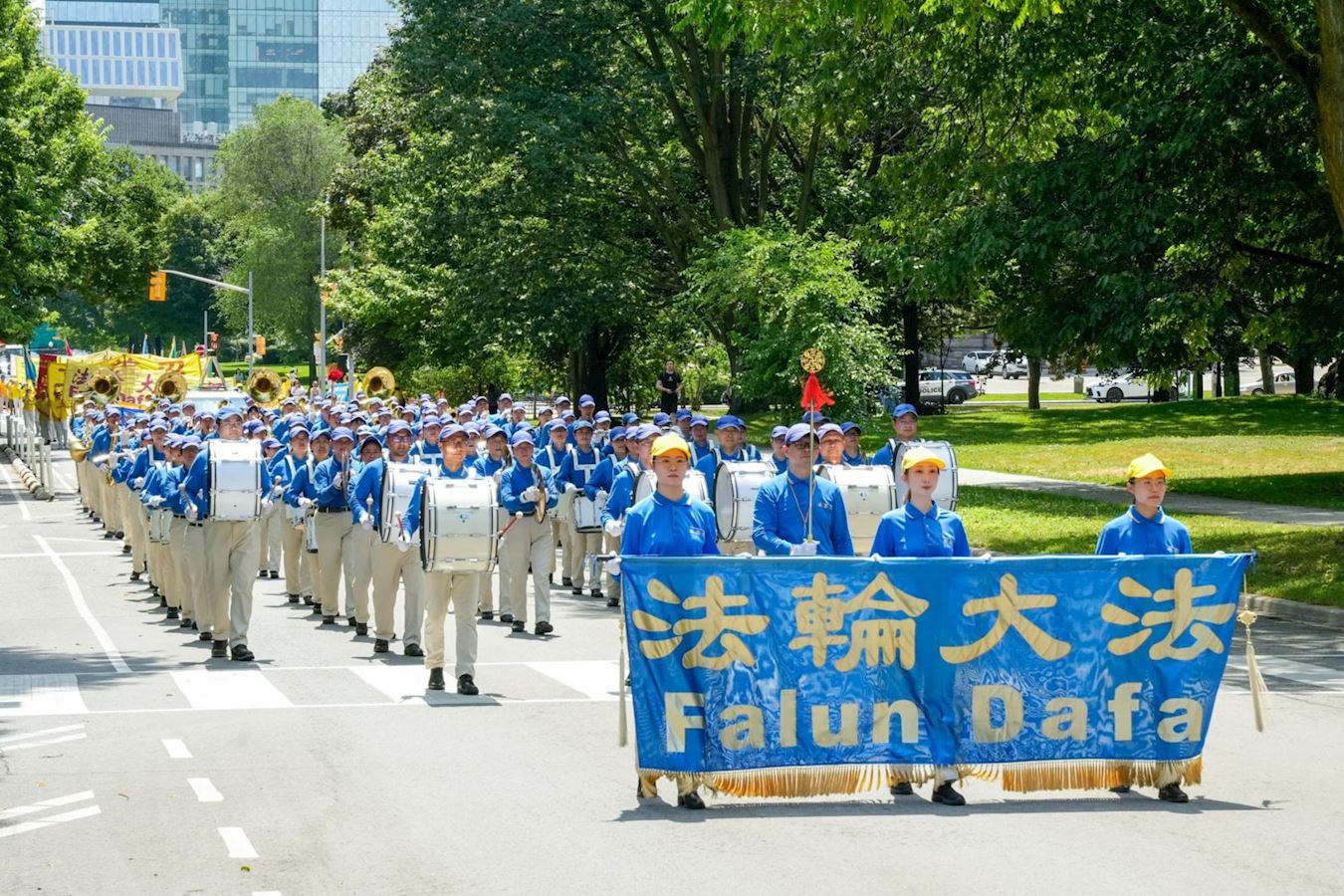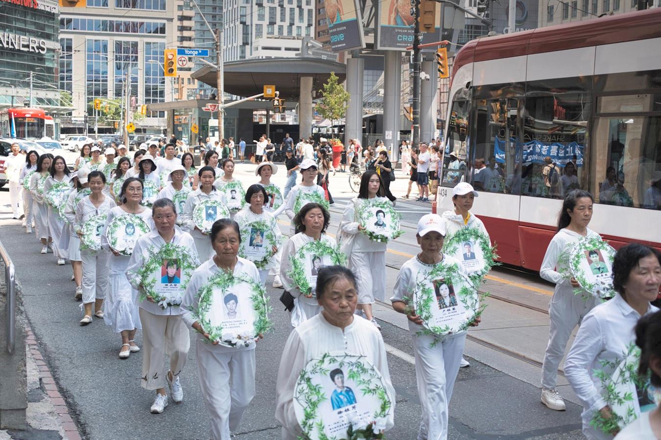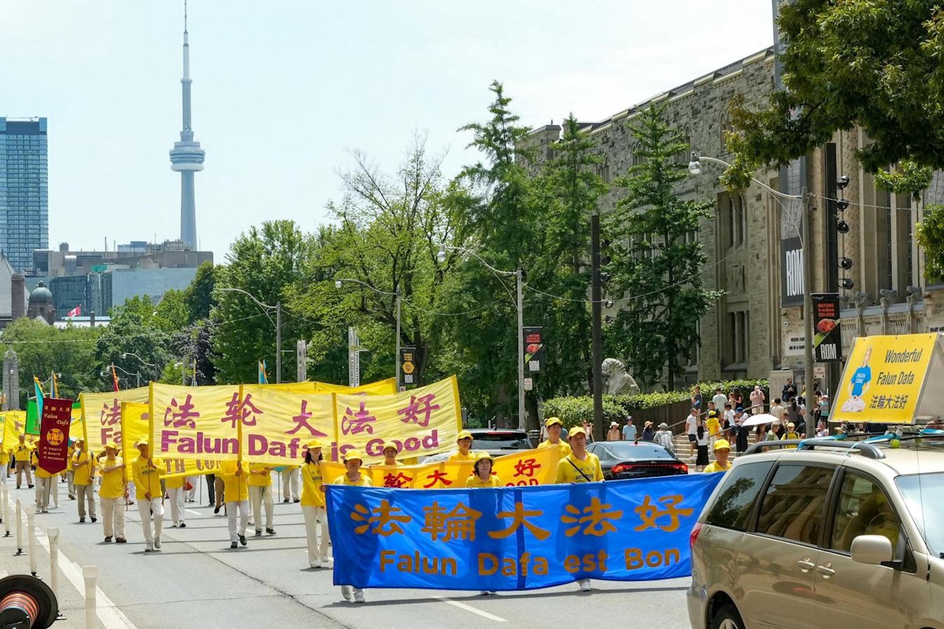 下午一点,学员们拉起各种横幅,组成浩大的队伍在市中心游行,向世人传递大法的真相,并揭露中共的邪恶本质。游行队伍途径大学路(University Avenue),布鲁亚街(Bloor Street),卑街(Bay Street)和登打士街(Dundas Street),最后沿学院街(College Street)回到皇后公园,全程约一个半小时。