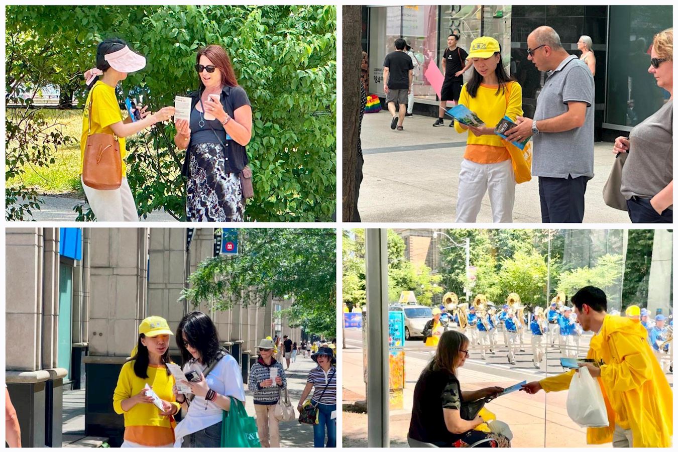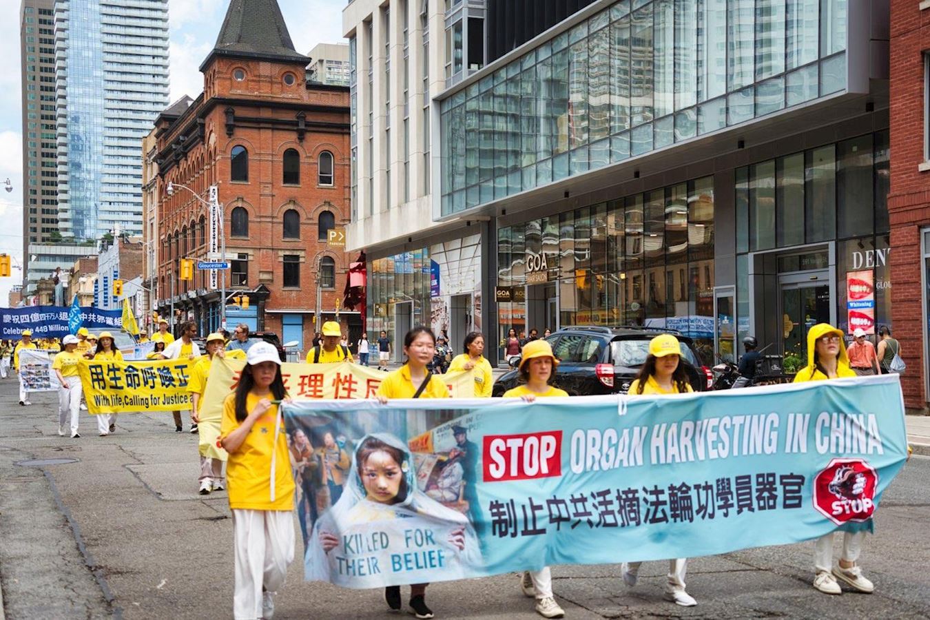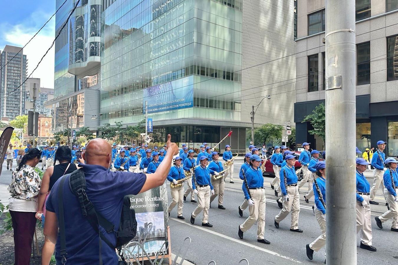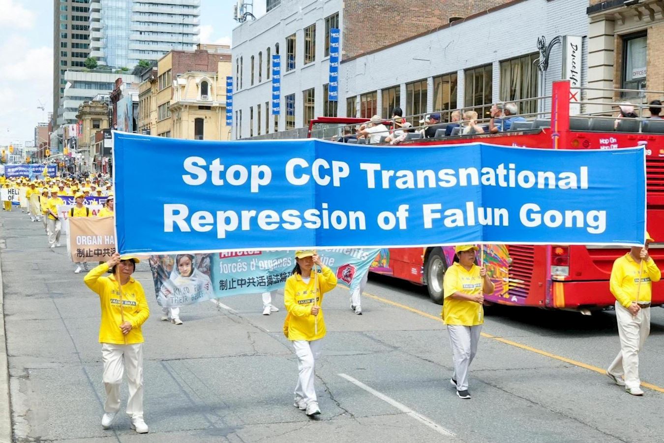 下午一点,学员们拉起各种横幅,组成浩大的队伍在市中心游行,向世人传递大法的真相,并揭露中共的邪恶本质。游行队伍途径大学路(University Avenue),布鲁亚街(Bloor Street),卑街(Bay Street)和登打士街(Dundas Street),最后沿学院街(College Street)回到皇后公园,全程约一个半小时。