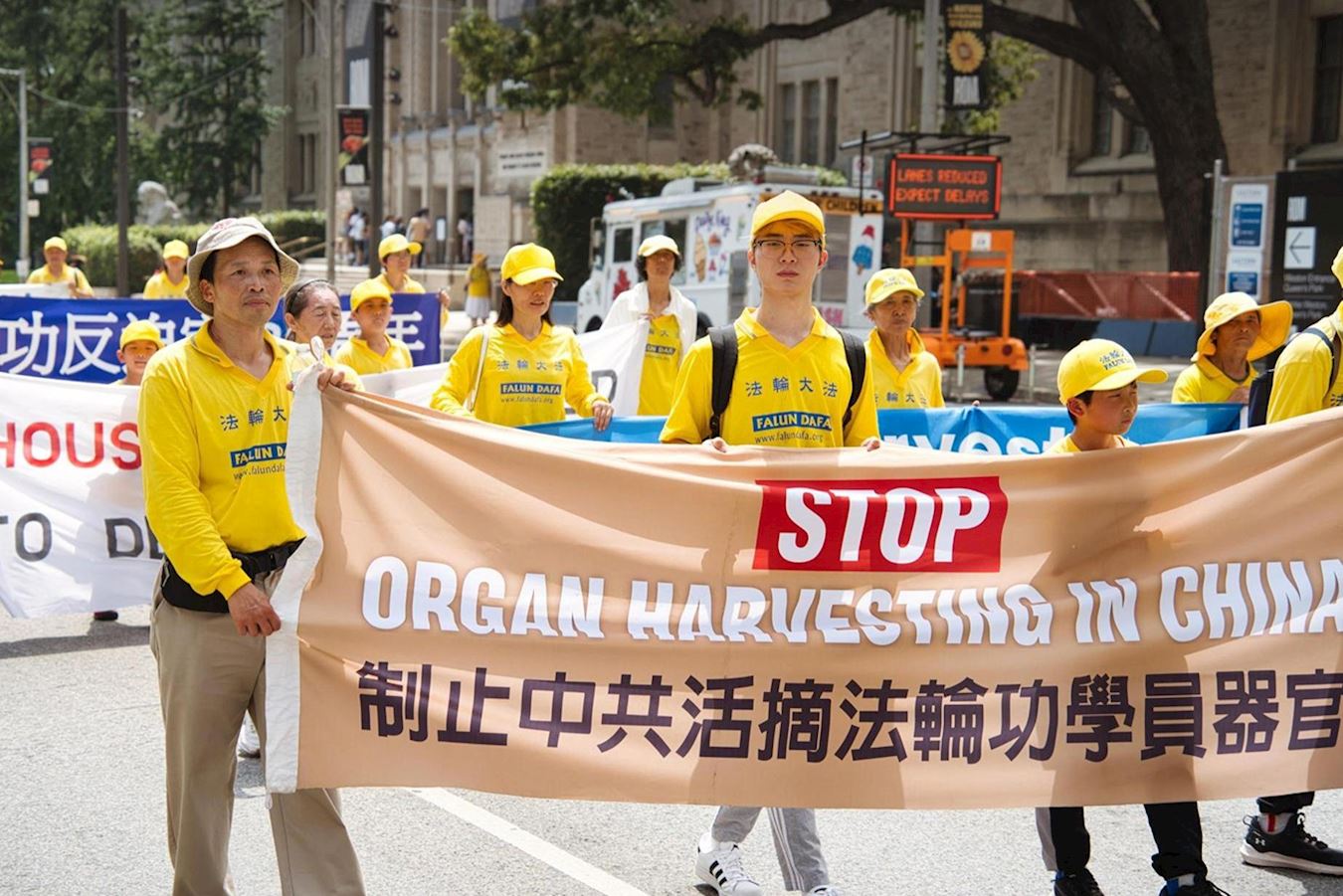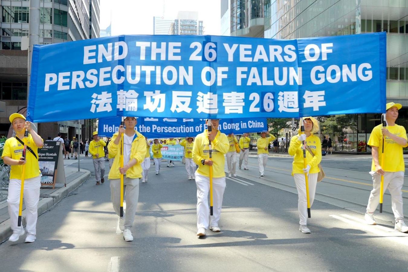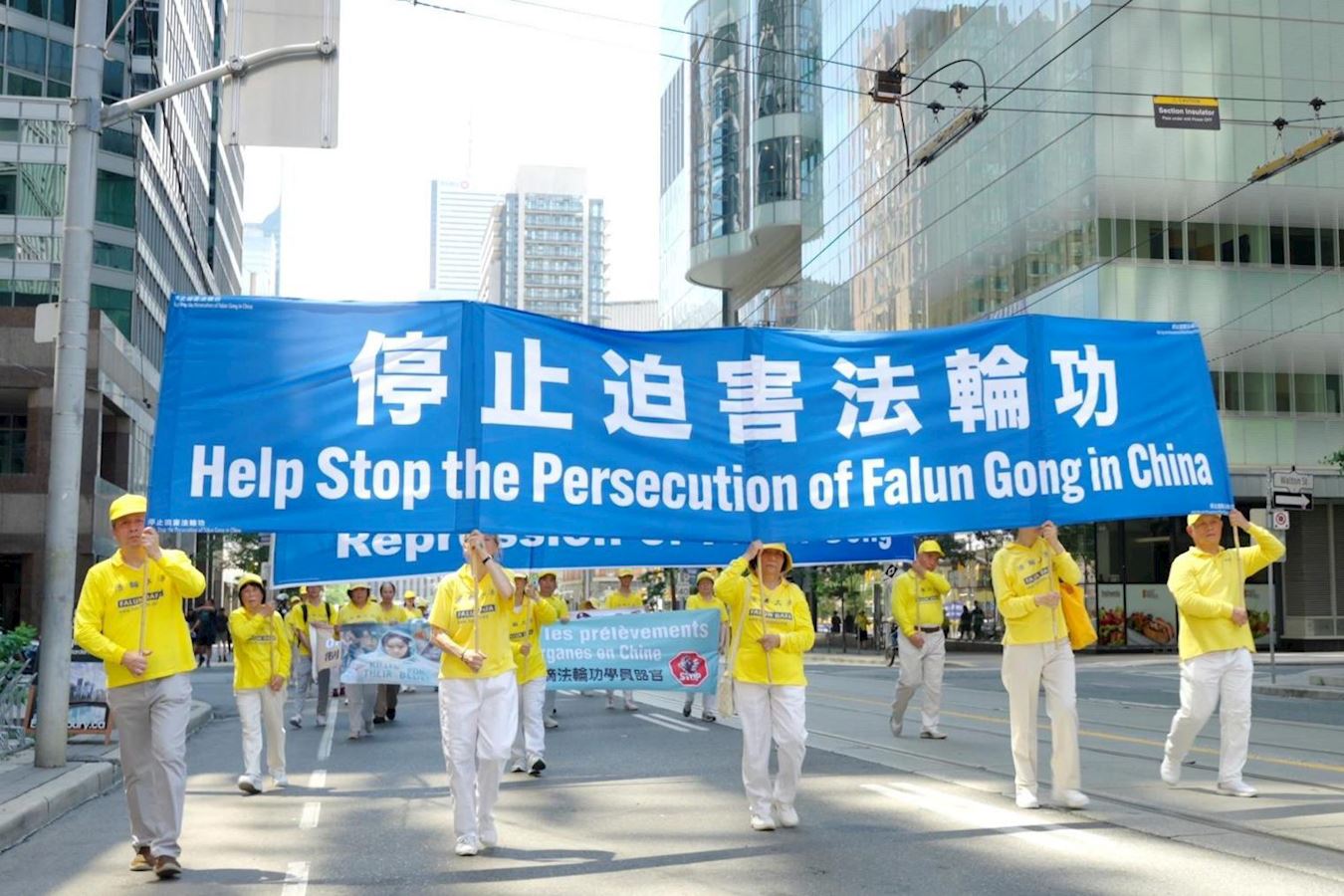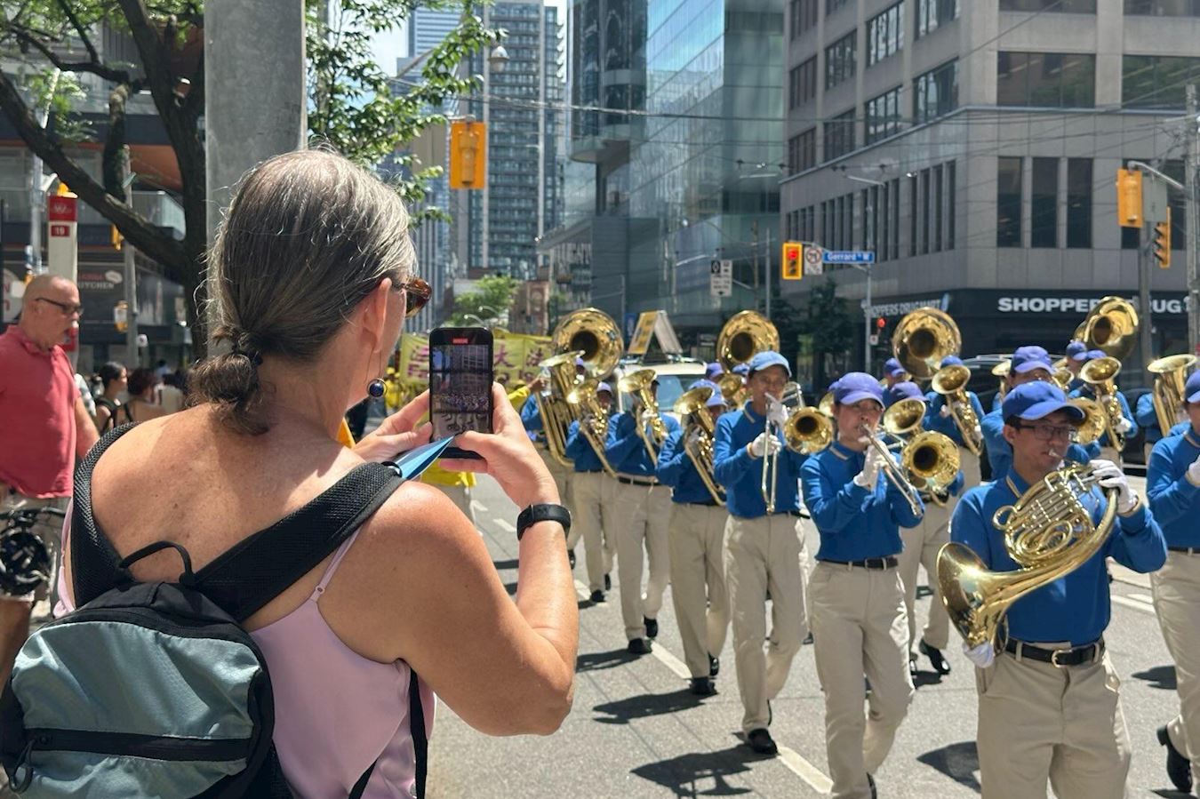 ![]() 图3~10:二零二五年七月十三日下午一点,加拿大法轮功学员们拉起真相横幅,组成浩大的队伍在市中心和平反迫害游行。 |