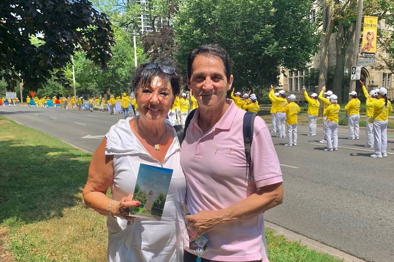 安杰尔(Angel)和他的妻子是来自西班牙的移民,现住在多伦多。当看到游行队伍前印有“法轮大法”字样的横幅时,安杰尔主动与学员攀谈,表示自己很喜欢游行队伍的风貌,并询问什么是法轮大法。