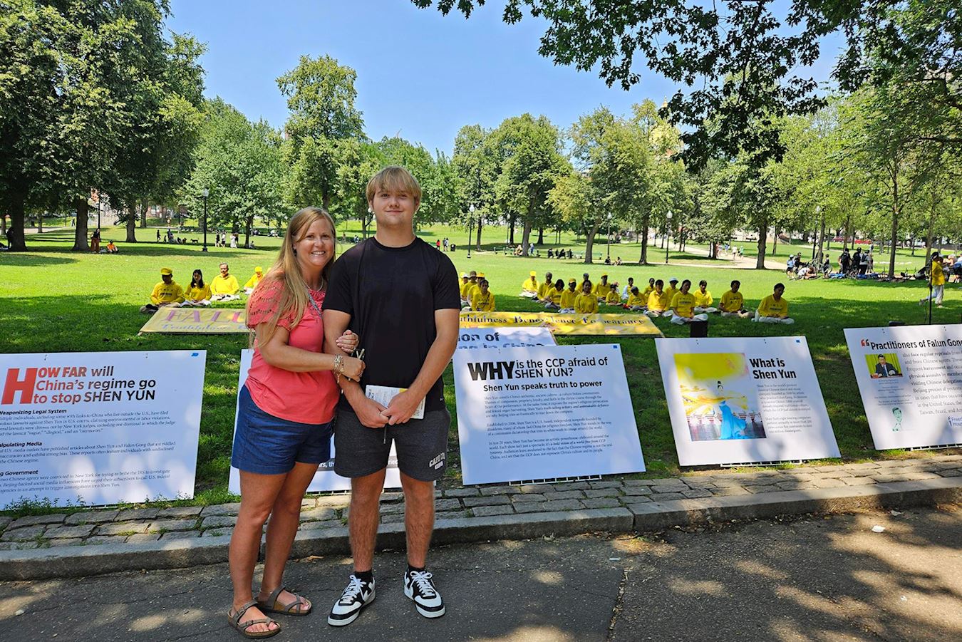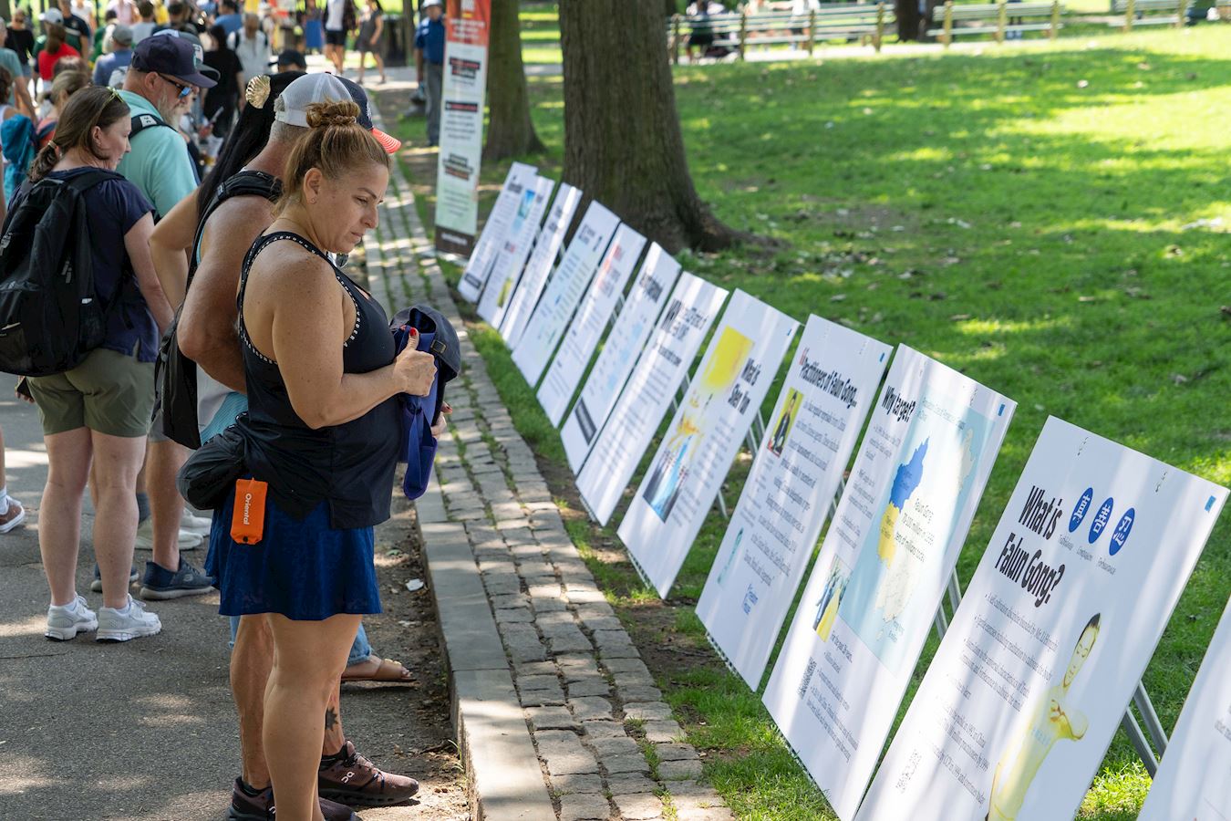 '图2~3:在波士顿公共公园,民众驻足观看法轮功真相展板,了解真相的人們纷纷在支持美国参议院通过《法轮功保护法案》的征签表上写下自己的名字。'