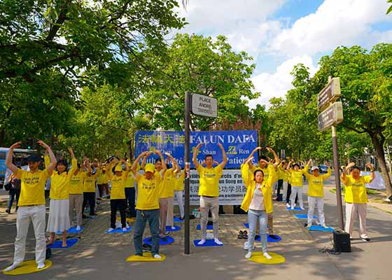 7月18日,比利时部分法轮功学员在布鲁塞尔中使馆前静坐、炼功,并向公众揭露中共迫害法轮功真相、及不择手段加剧跨国镇压的行径。