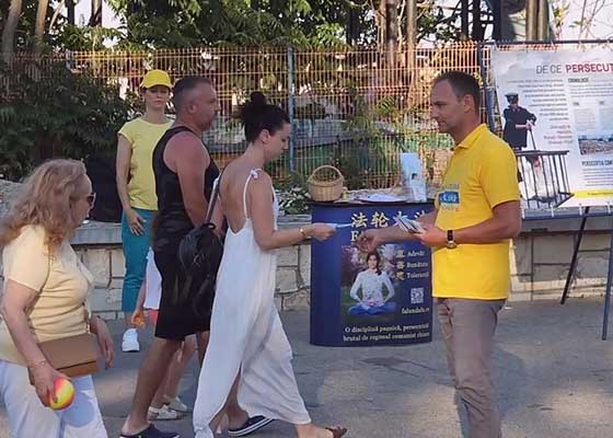 7月13日,法轮功学员在罗马尼亚的海滨城市马马亚举办了信息日活动,向民众展示法轮大法真善忍的美好,揭露中共持续迫害法轮功的真相。
