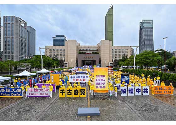 七月十九日下午,台北、桃园、新竹、苗栗部分法轮功学员在风雨中举行反迫害二十六周年大游行。游行从台北市政府市民广场出发,经过逸仙路、松高路、松仁路、松寿路、基隆路,再回到市政府前。