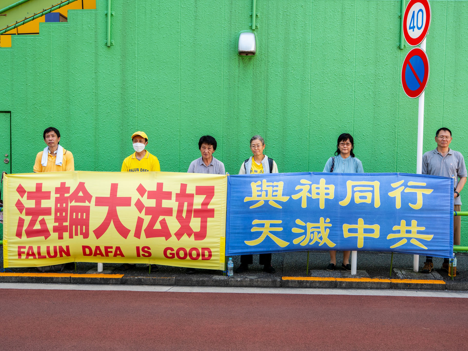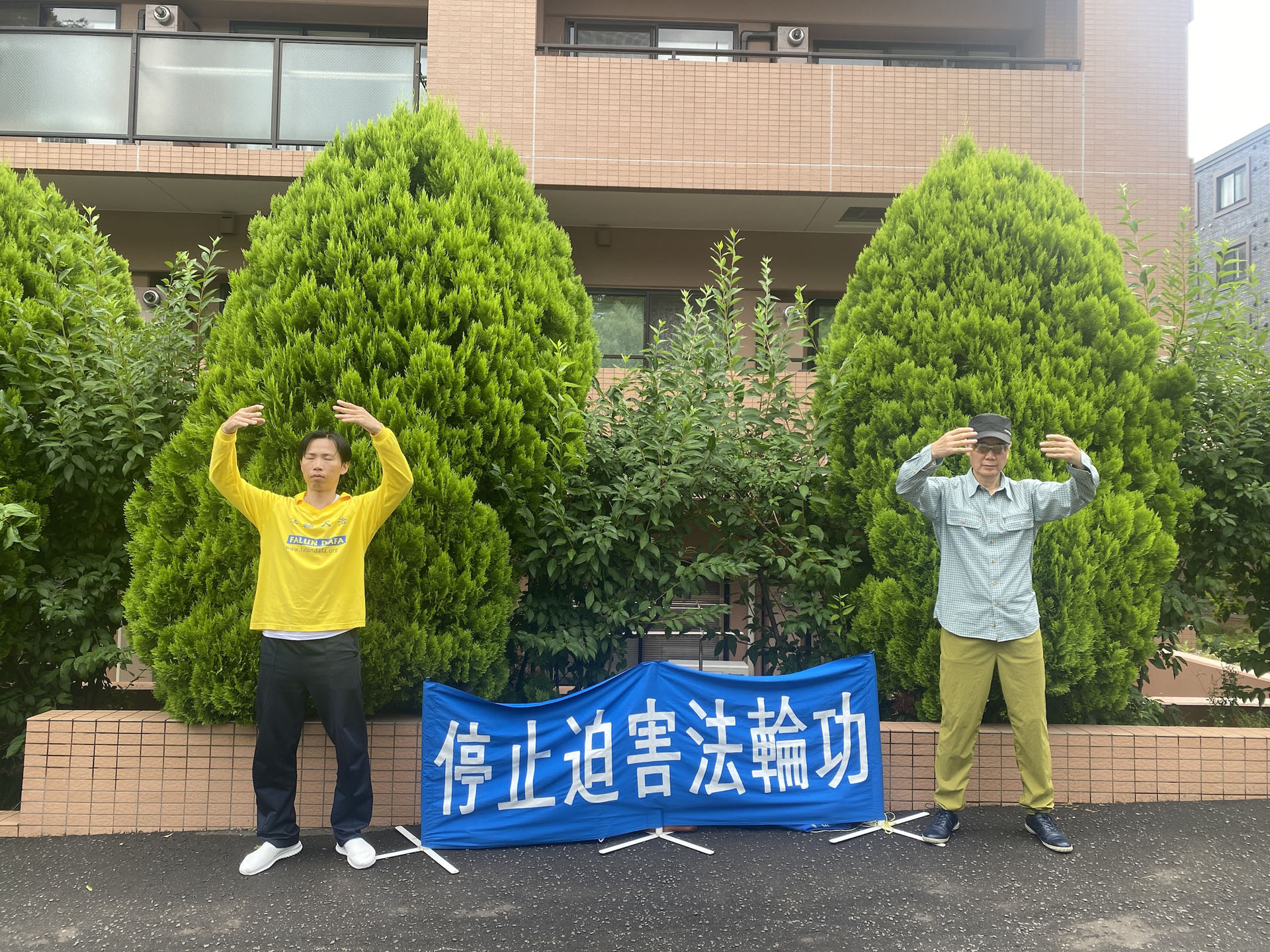 东京的部分法轮功学员上午来到中共驻日本大使馆前,安静地站成一排,打出横幅,和平反迫害。他们年复一年,每天如此。