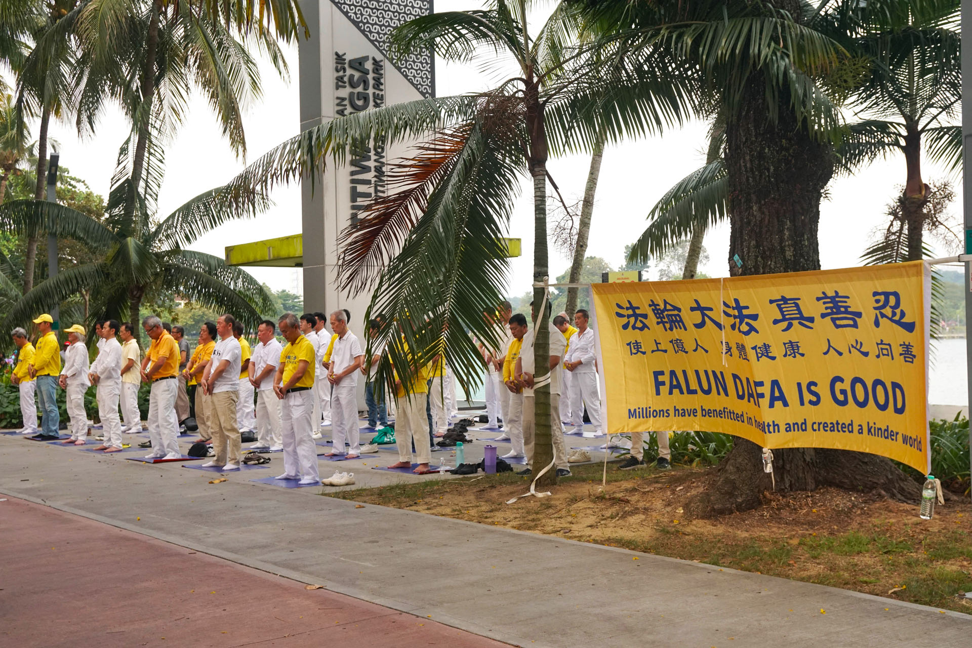 ![]() 图1~3:马来西亚法轮功学员在吉隆坡蒂蒂旺沙湖滨公园举行反迫害活动,并在湖边集体炼功。 |