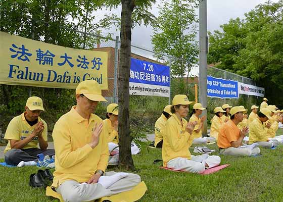 七月二十日,法轮功学员在加拿大首都渥太华中使馆前和平抗议,呼吁结束中共长达二十六年对法轮功的迫害。