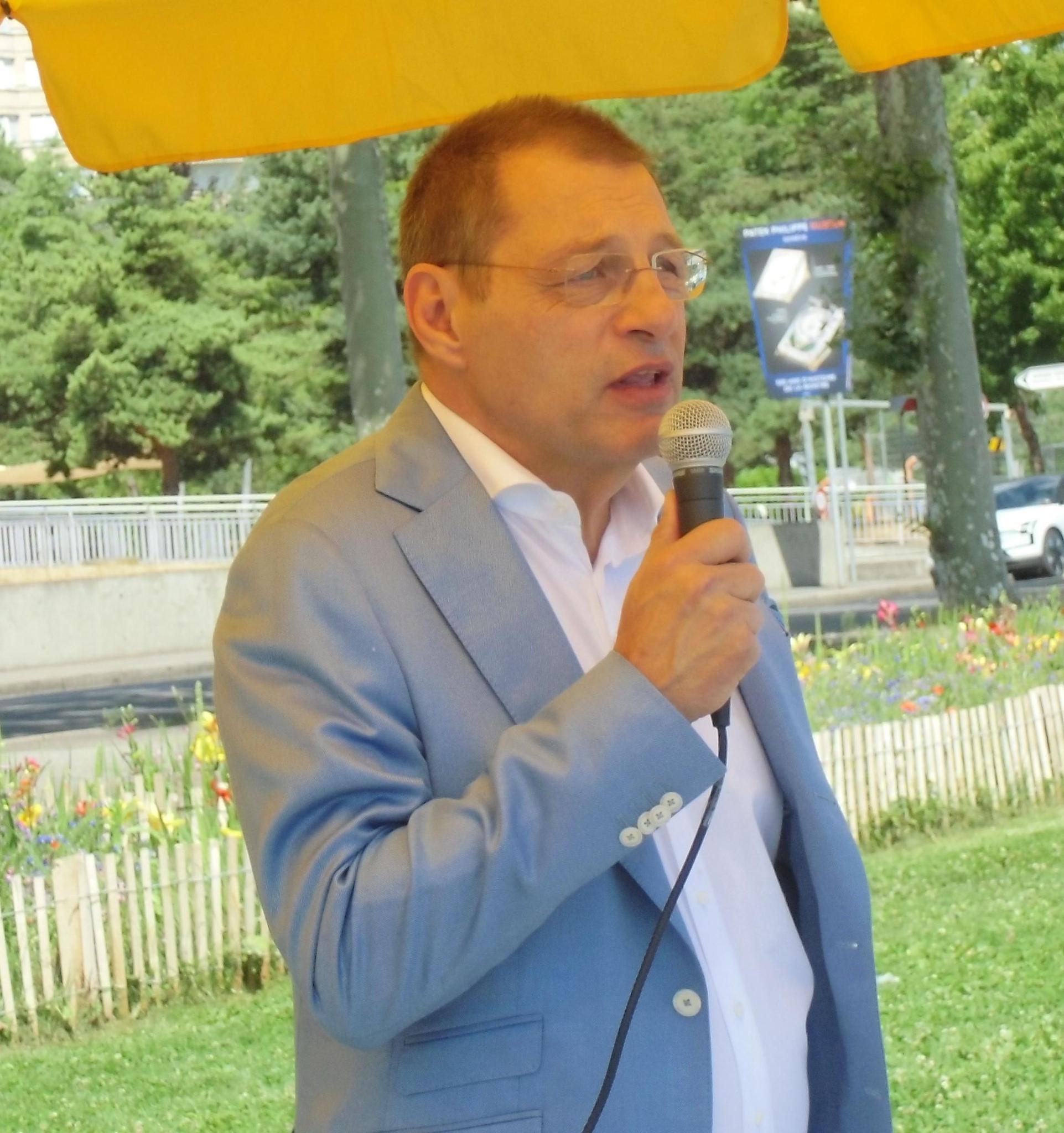 ![]() 图4:日内瓦大议会议员克里斯托·伊万诺夫先生(Christo Ivanov)在现场发言,希望法轮功学员坚持反迫害,让更多人知道法轮大法好。 |