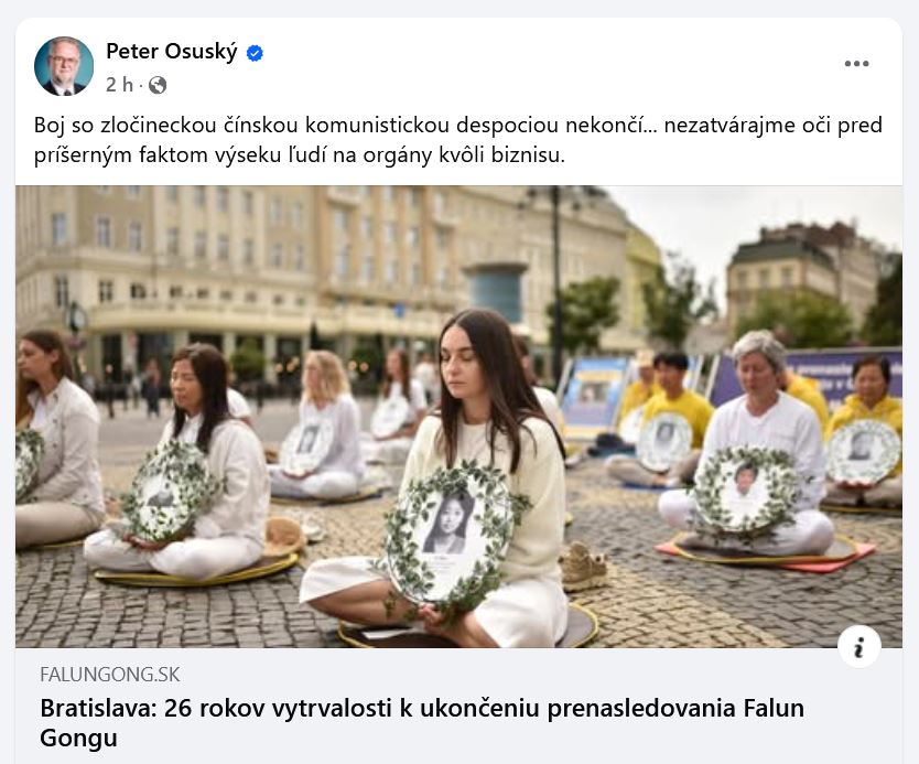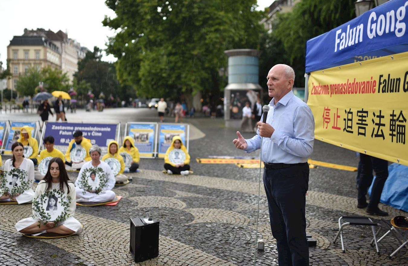 前国会议员彼得‧奥苏斯基(Peter Osuský)在演讲中表示,法轮功学员多年来一直在中共驻布拉迪斯拉发的大使馆前和平抗议,并揭露共产主义政权对法轮功的迫害罪行,但迫害直到今天仍在持续着。