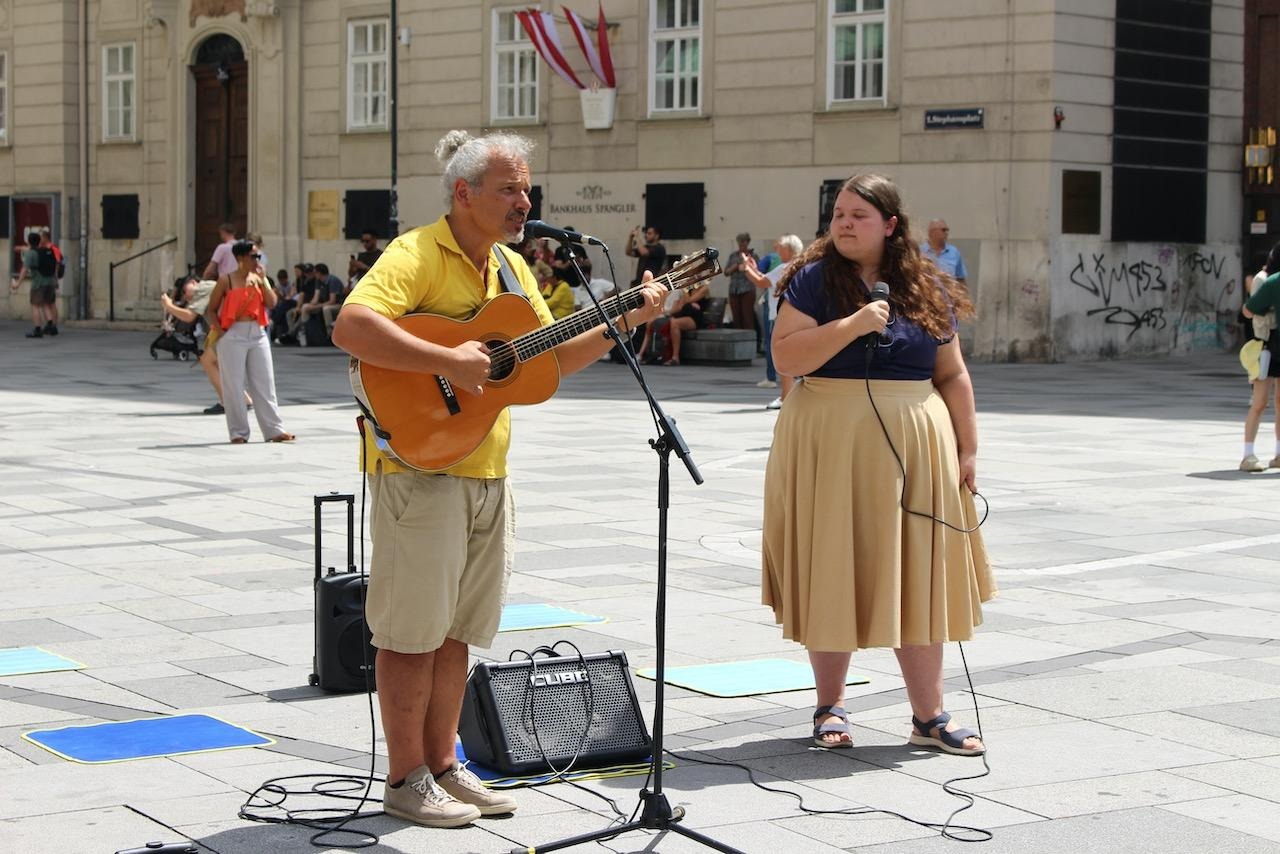 活动期间,两位学员用歌声表达了他们对法轮大法的热爱以及对迫害仍在继续的悲伤,路人深受感动。