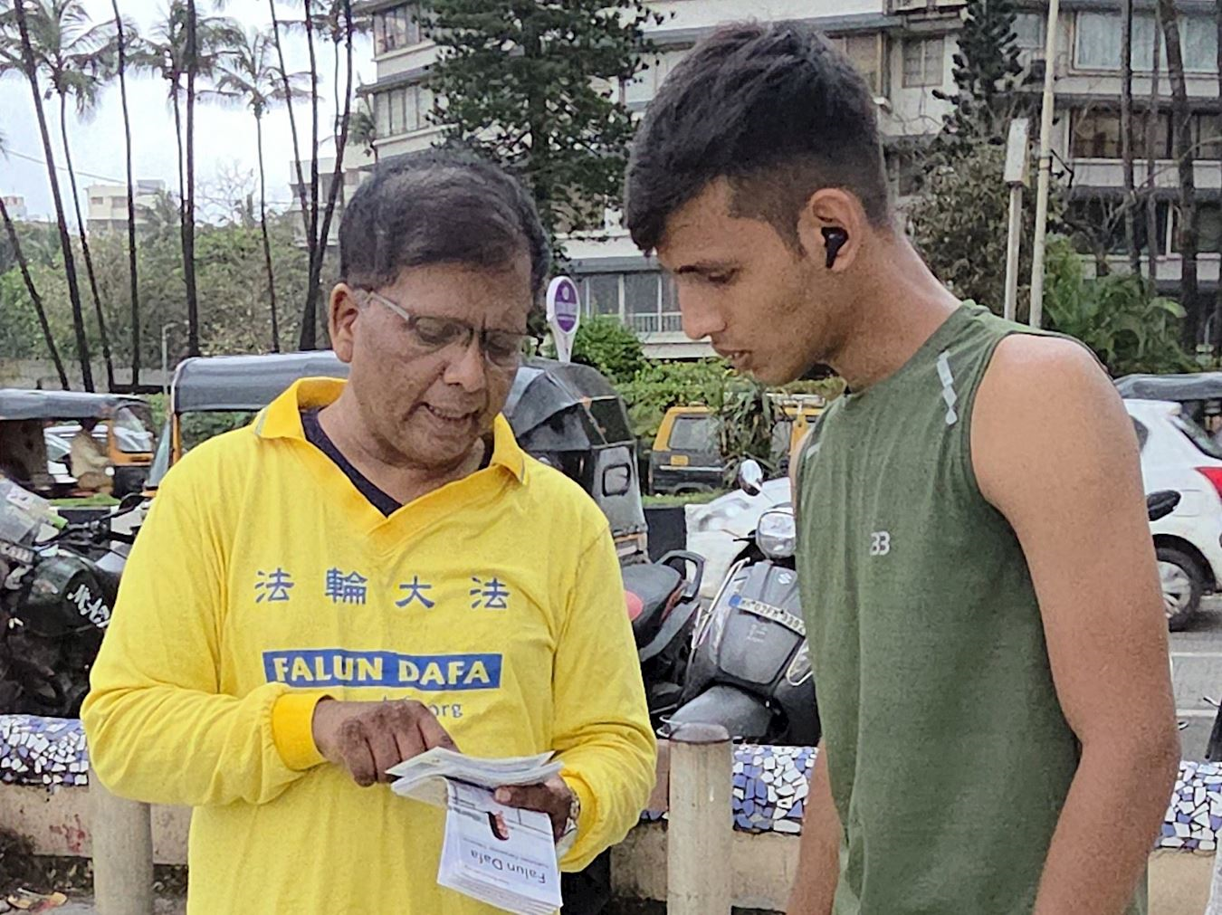 ![]() 图6:一名孟买男士向学员了解有关法轮大法和中共迫害的情况。 |