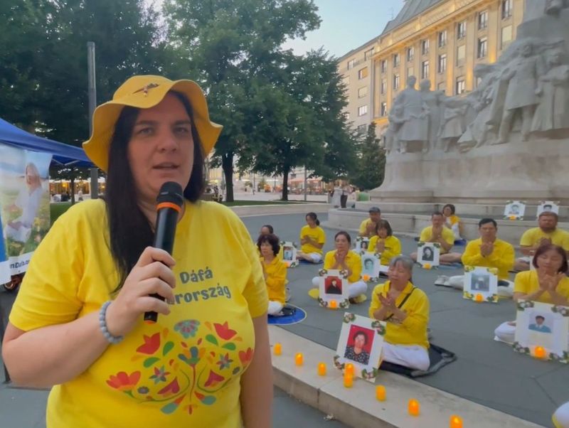 匈牙利法轮大法学会发言人埃斯特(Eszter)女士在集会中发言,她说:“一九九九年七月二十日,前中共党魁江泽民开始迫害法轮功,它叫嚣‘名誉上搞臭,经济上截断,肉体上消灭’。法轮功学员被抄家,被非法关押在劳教所、监狱和精神病院中,还不断的遭受酷刑折磨甚至被虐杀,这种种族灭绝至今仍在继续。”