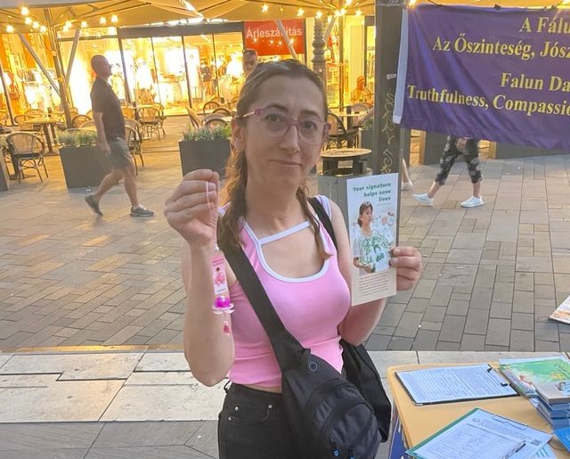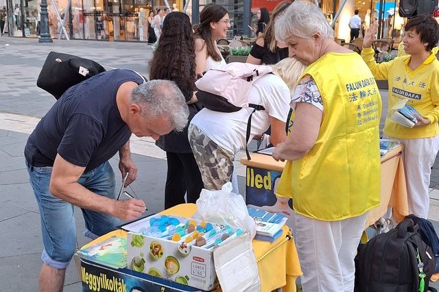 佐尔坦(Zoltán)和朋友来自埃尔德(Érd),看到关于活摘器官的横幅后,佐尔坦主动询问这是怎么回事,了解到事实真相后,佐尔坦感到非常震惊,随即在谴责迫害的请愿书上签下自己的名字。