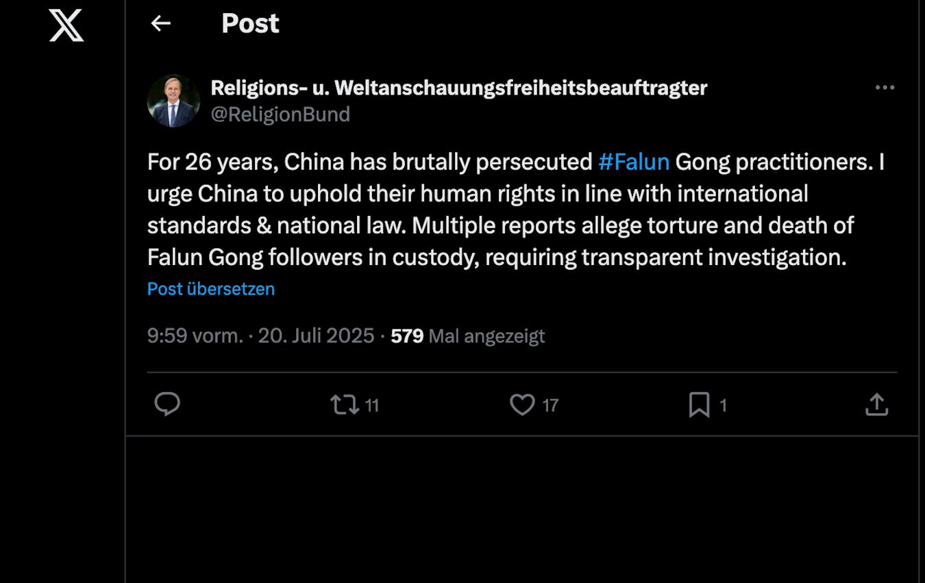 德国政府宗教与信仰自由专员、基民盟(CDU)联邦议会议员、外国文化教育政策小组委员会成员托马斯·雷切尔(Thomas Rachel)于七月二十日在X平台发声援文章如下: