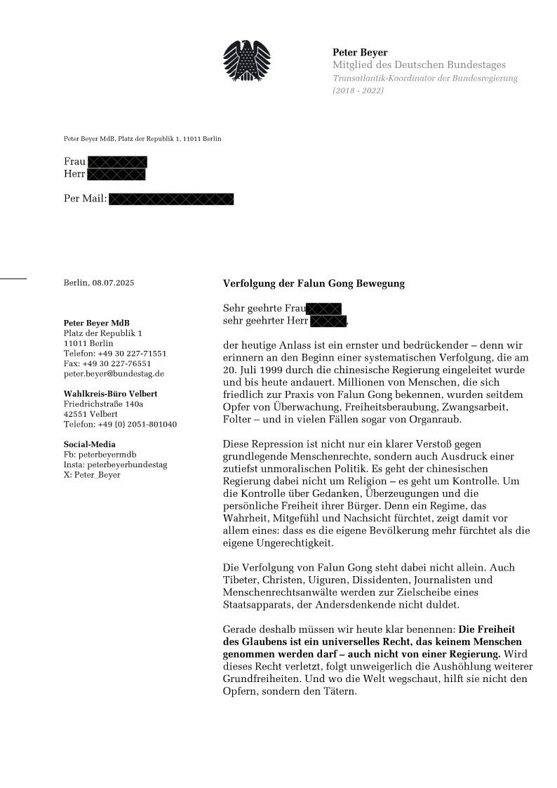 德国基民盟(CDU)联邦议会议员、安全与稳定项目组主席彼得·拜尔(Peter Beyer)发来声援信如下: