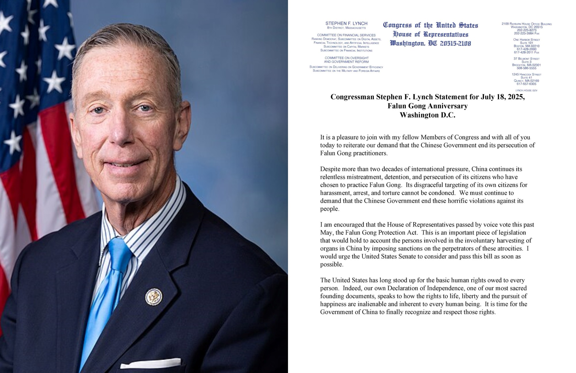 马萨诸塞州民主党联邦众议员史蒂芬·林奇在声明中说:“很高兴今天能与国会同僚及各位一起重申,我们要求中(共)国政府结束对法轮功修炼者迫害的诉求。”