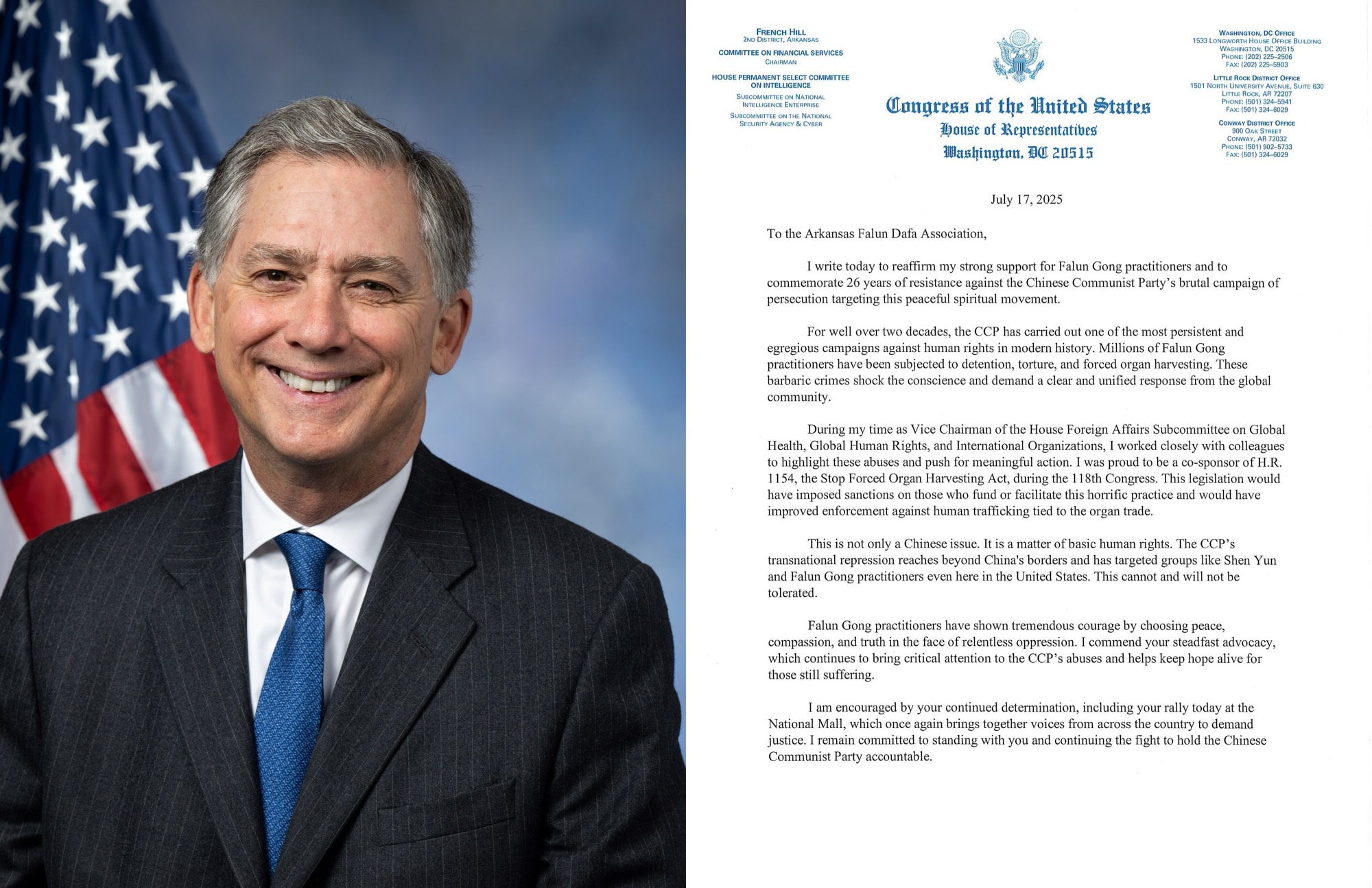 ![]() 图7:美国阿肯色州共和党联邦众议员法兰奇·希尔(Rep. French Hill)致信声援法轮功学员。 |