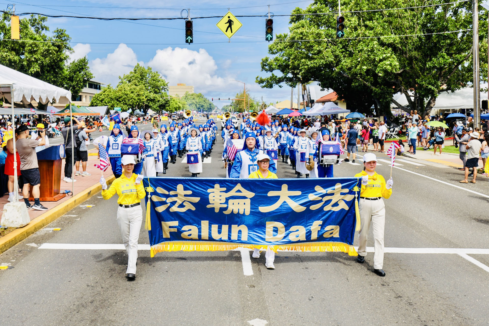 天国乐团的学员们身穿鲜艳唐装、头戴传统帽饰、脚踏黑色长筒皮鞋,动作整齐划一;后面是日本法轮功学员组成的腰鼓队,关岛当地学员也沿途发送大法的真相传单。