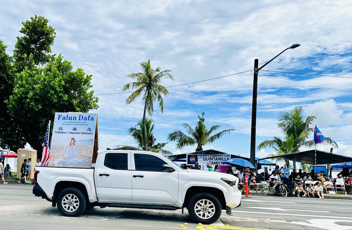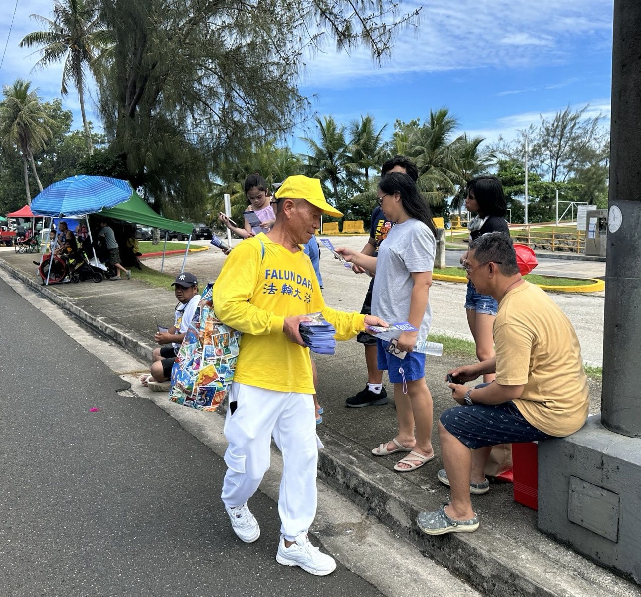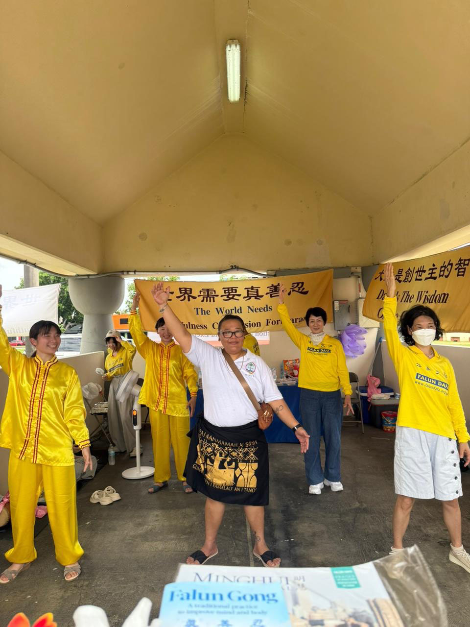 在关岛查莫洛夜市,当地学员租用两座西班牙传统风格的亭子,且用醒目的各式横幅、莲花与看板布置得典雅别致,吸引了许多游客驻足观看。来自台湾与日本的学员也利用空档与当地学员一同向现场的有缘人介绍法轮功,分享修炼的美好与身心受益的经验。天国乐团与腰鼓队的表演吸引大量民众观赏,许多人在观赏后主动前往摊位了解法轮大法的真相,甚至当场学炼功法。