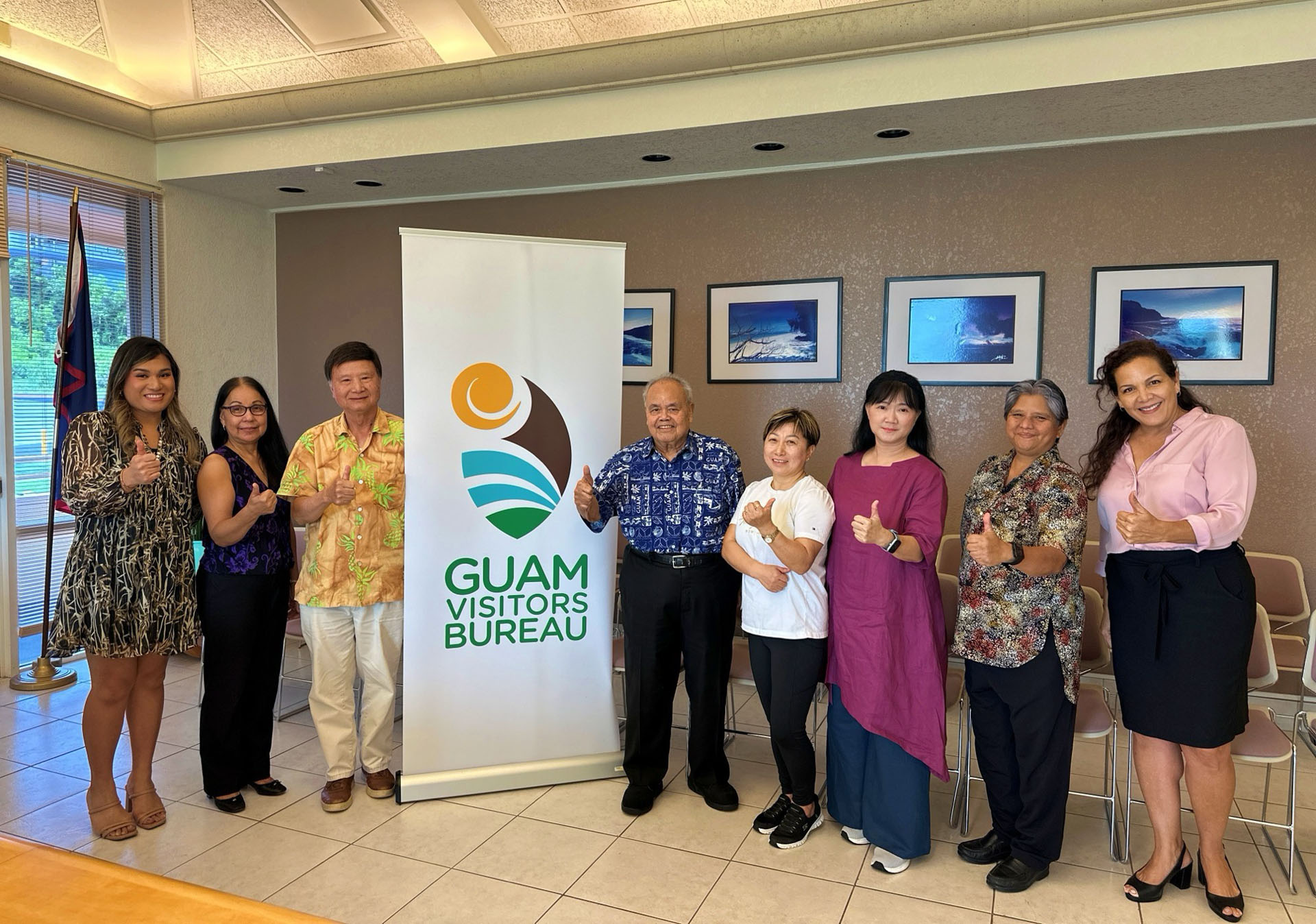 在参加关岛解放日庆祝活动期间,来自台湾与当地法轮功学员代表拜会了关岛两个政府机关。在和关岛观光局(Guam Visitors Burea, GVB)副局长杰拉尔德·盖利·佩雷兹(Gerry Perez)见面时,佩雷斯对远道而来的法轮功学员们,表达诚挚感谢,并希望明年有更大阵容的天国乐团来关岛参与庆祝活动。会谈其间学员也向在场的观光局官员分享法轮大法的美好及真相。