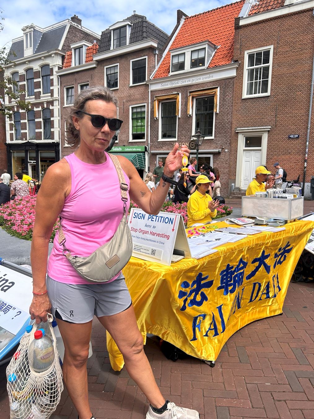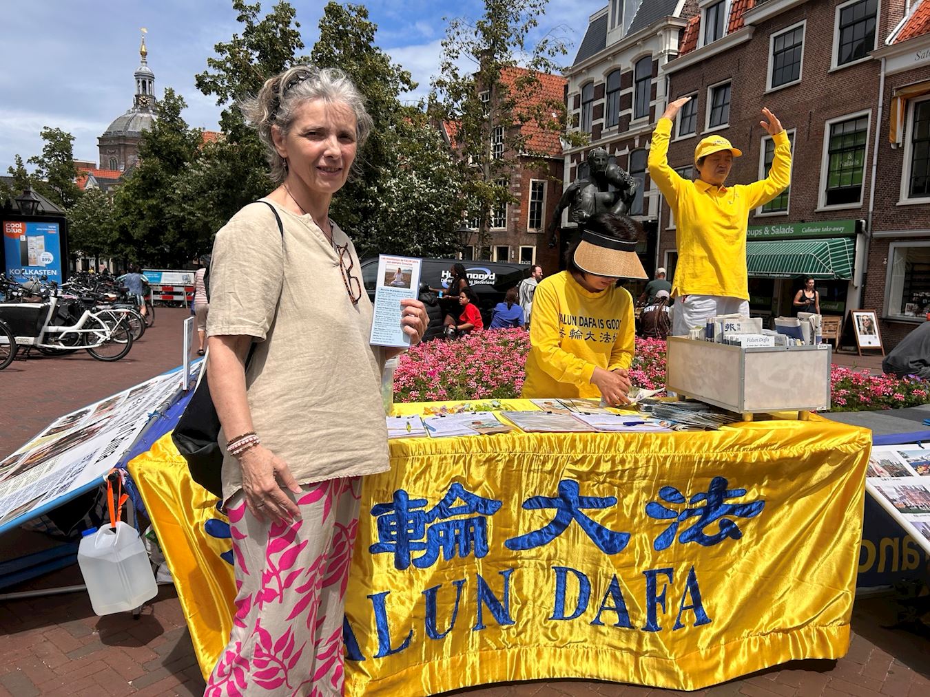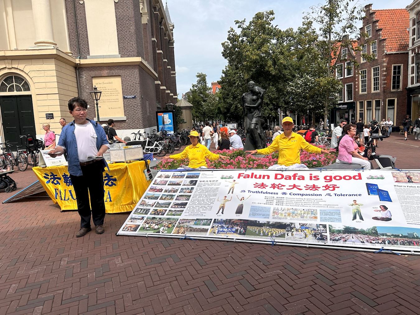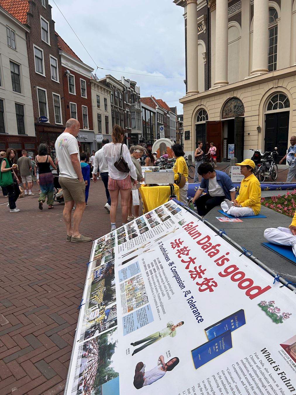 活动当天,学员们在莱顿市中心哈雷梅尔街(Haarlemmerstraat)布置“法轮大法弘传世界”和“承受无名苦难 呼唤正义良知”两块展板,展示法轮功功法,发放传单,向路人介绍法轮功真相,有来自中国大陆的移民感叹:“法轮功真了不起,经过这么多年的(中共)镇压还屹立不倒!”