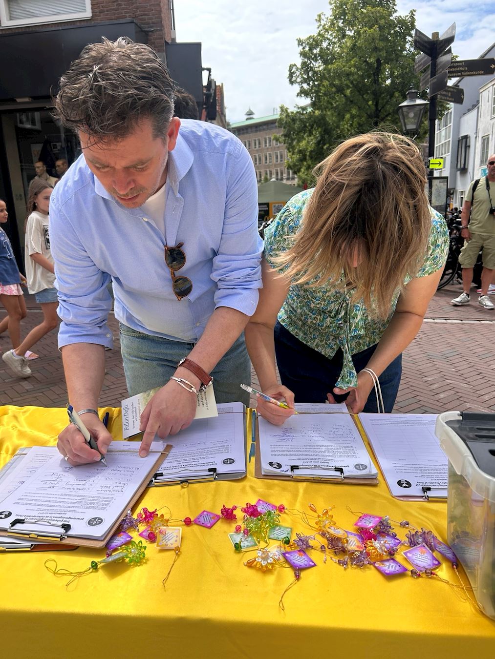 沟通顾问沙克曼女士(M.Shakman)和先生杰克(H. Jechuel)在街头看到真相点,立即停下脚步走过来签名,他们对中共活摘人体器官表示极大的愤怒。