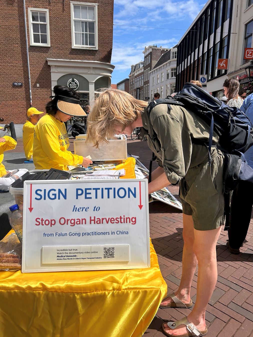 人们还被法轮功学员遭到中共非法迫害的展板信息所吸引,特别对强摘器官的内容感到震惊。很多人了解真相后都签名表示支持法轮功学员的反迫害活动。