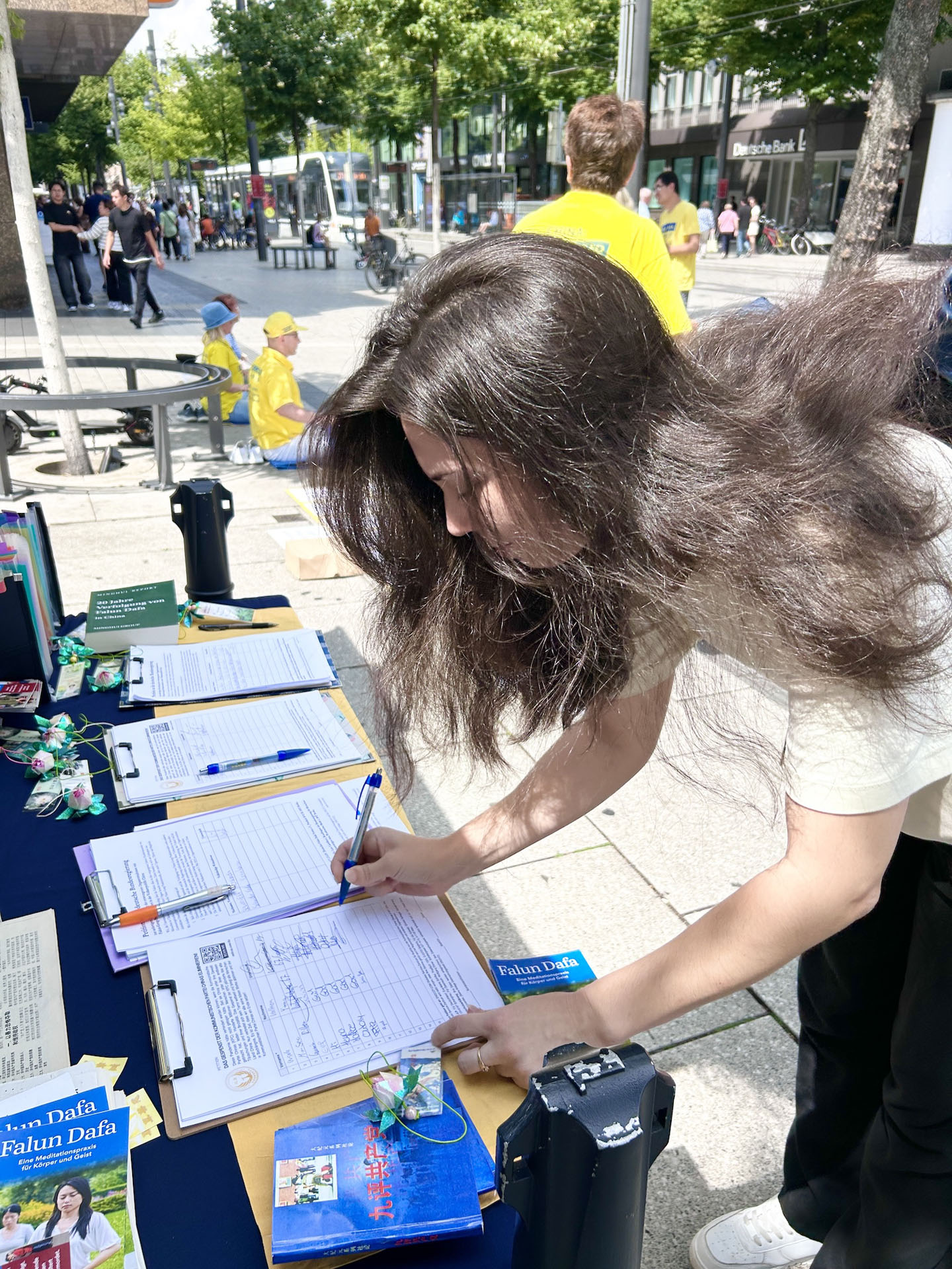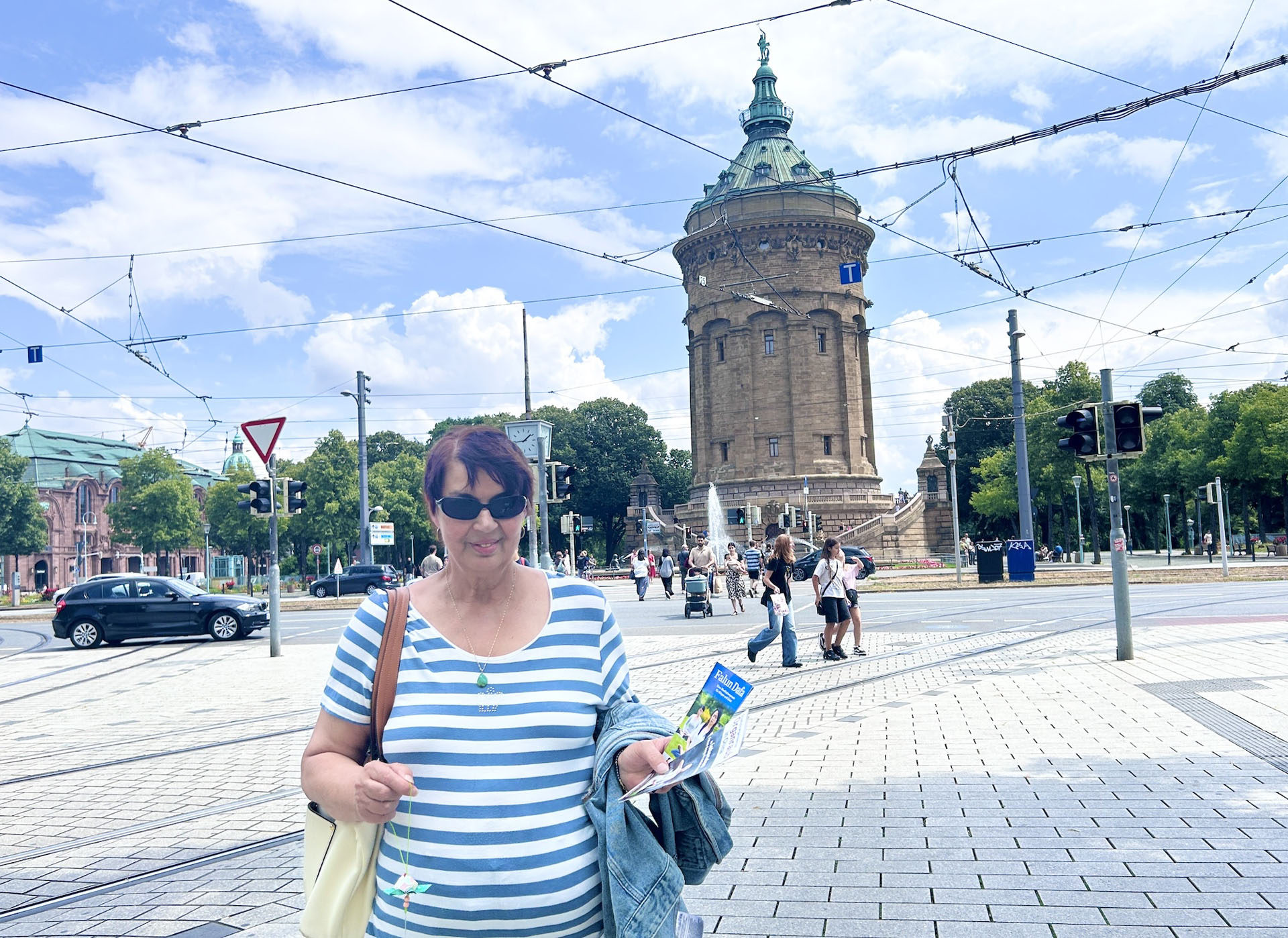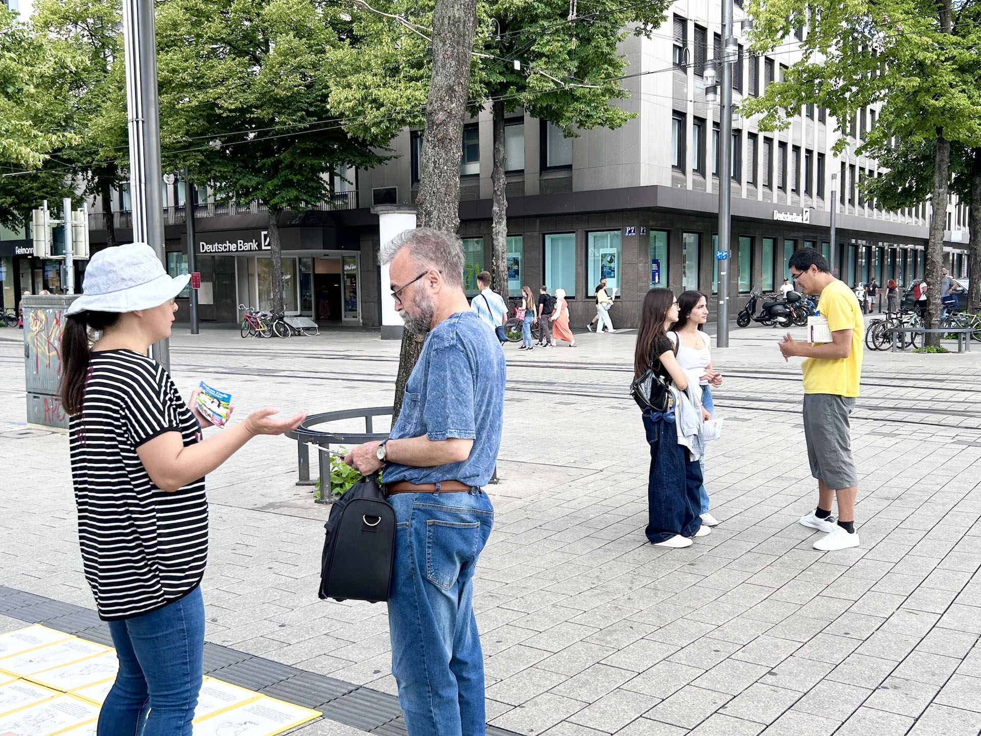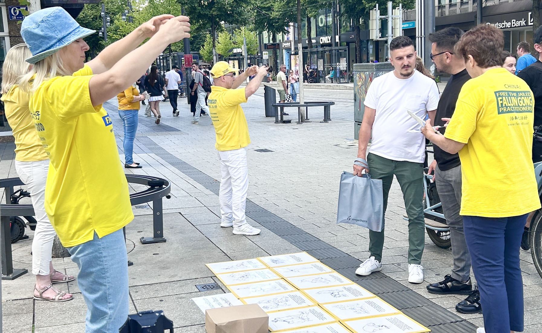 图2:二零二五年七月二十六日, 德国法轮功学员在曼海姆水塔(Wasserturm)对面步行街弘法,反迫害。图为学员在向路人演示功法。