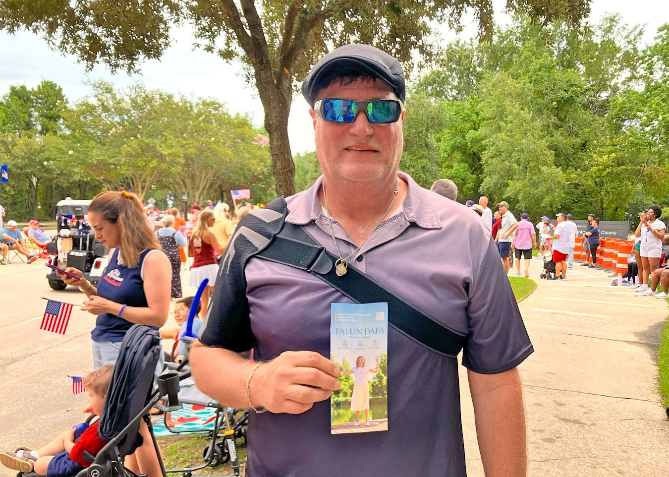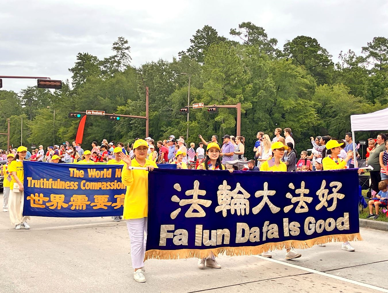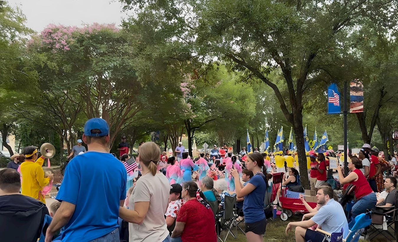 在热闹繁华的镇中心和市场街,各个游行团体盛装出席,喜气洋洋。走在法轮功队伍最前方的是手持美国国旗的学员,随后是“法轮大法好”、“世界需要真善忍”、“法轮大法在德州”的横幅队,以及花车、彩旗和腰鼓队等。路边民众有的挥舞国旗为学员鼓掌喝彩,有的用相机拍下法轮功的风采,还有的主动要真相资料,想了解什么是法轮功。