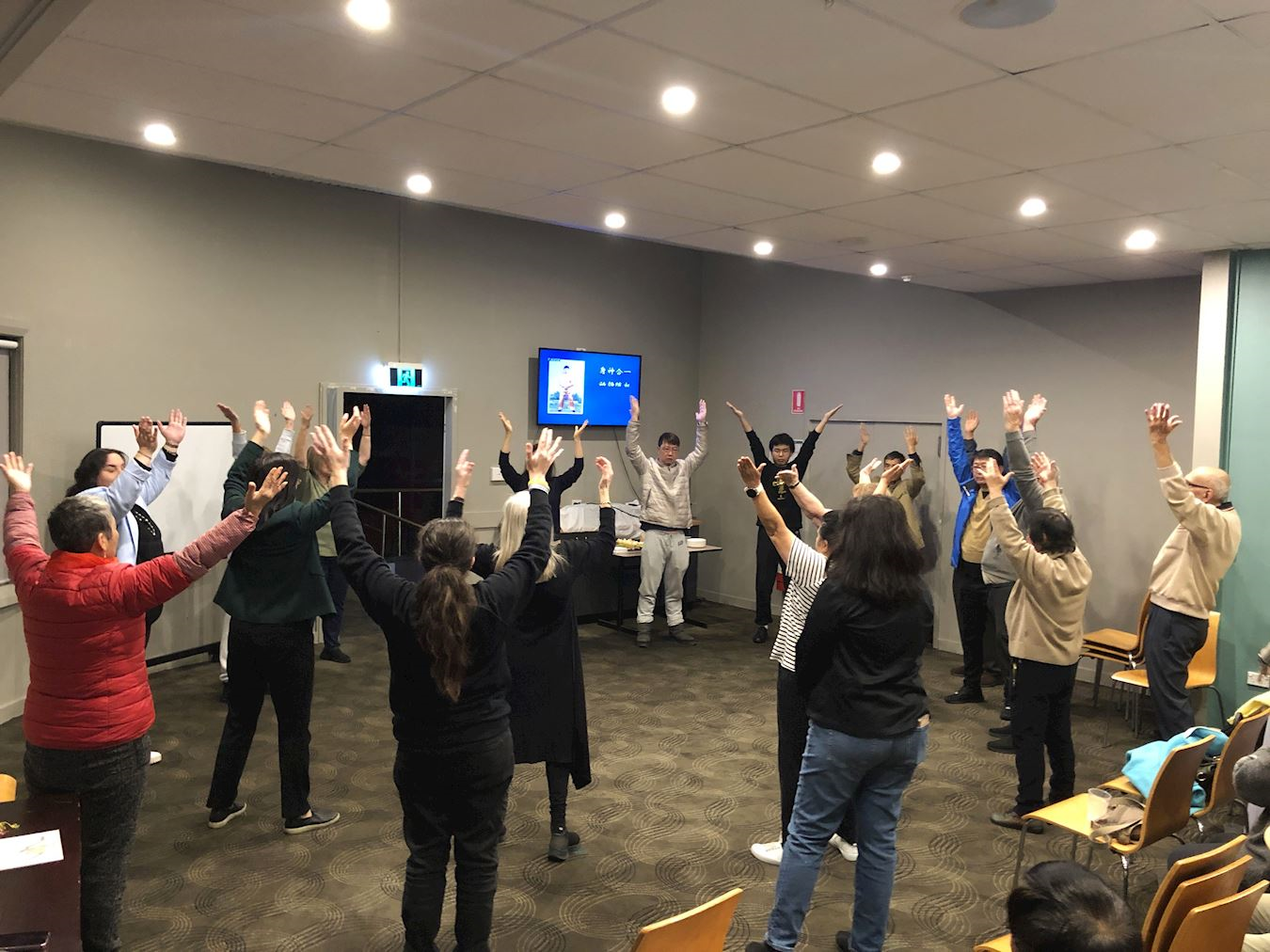 ![]() 图1:参与免费教功班的学员正在一齐学炼法轮功 |