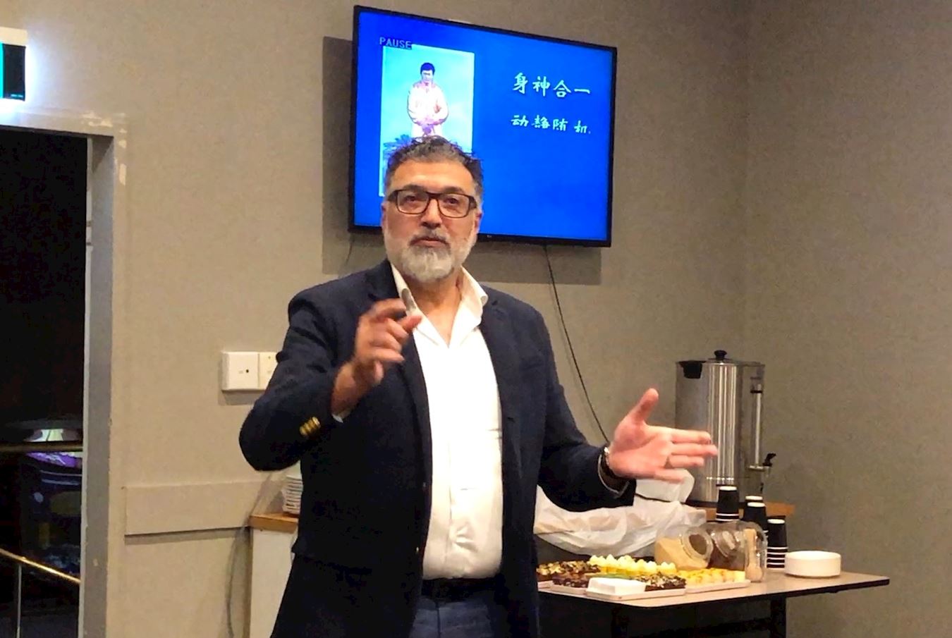 ![]() 图4:市议员萨德·阿布-萨曼正在法轮功免费教功班上演讲。 |