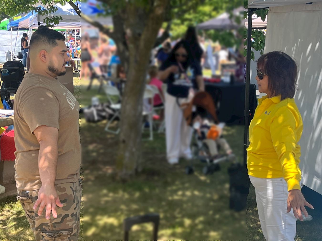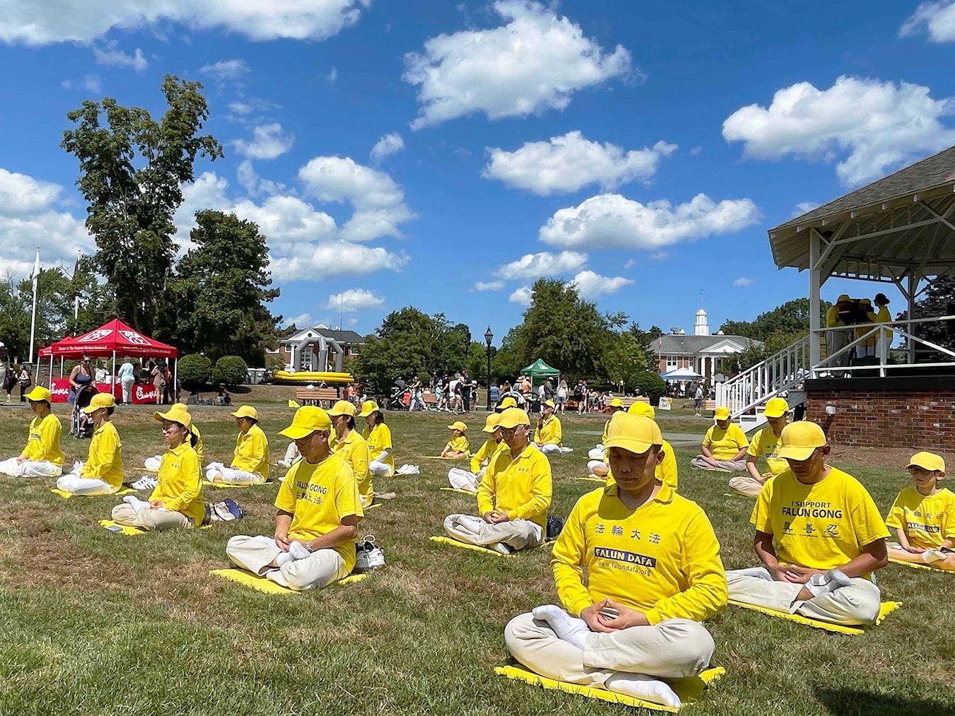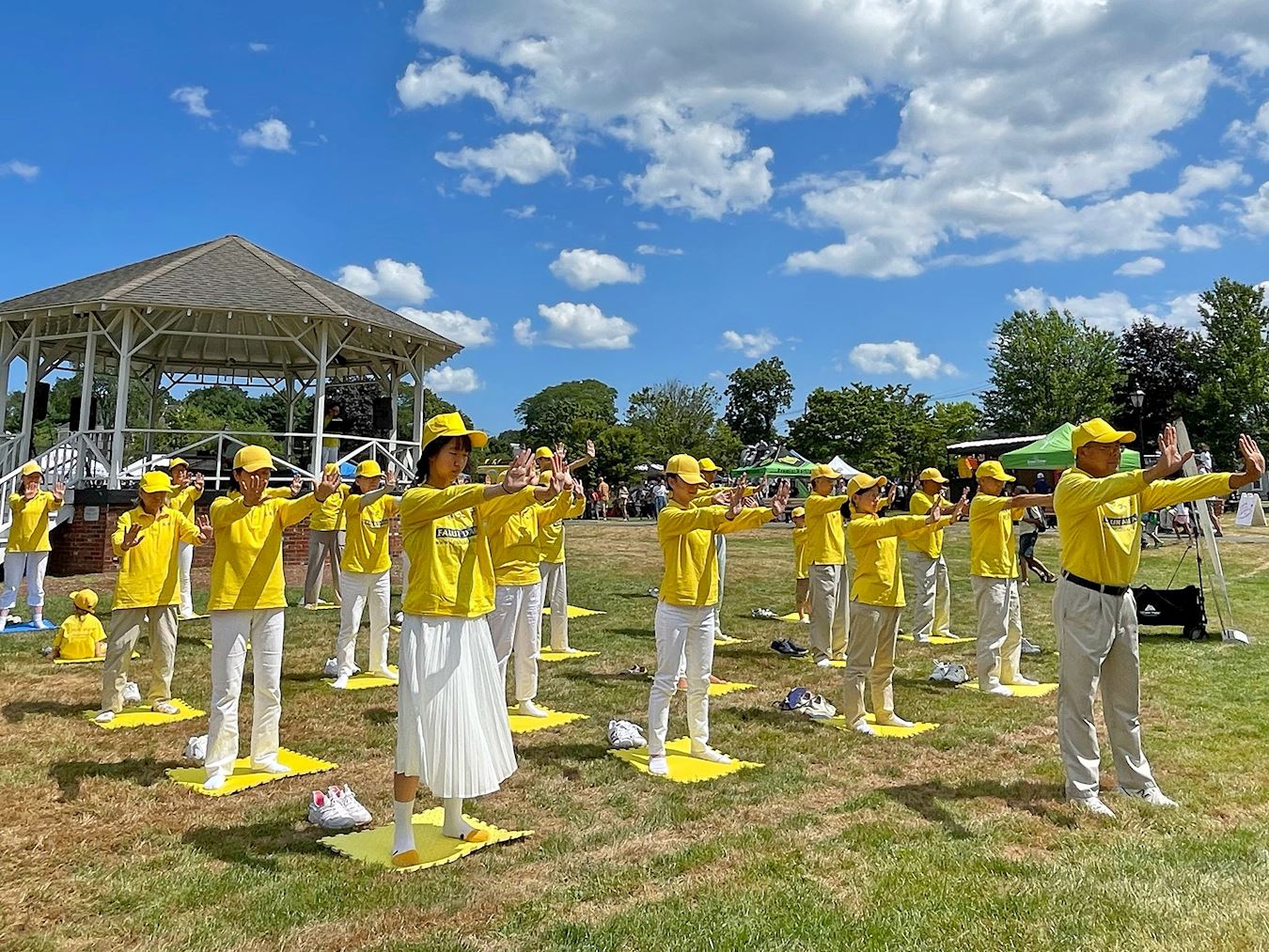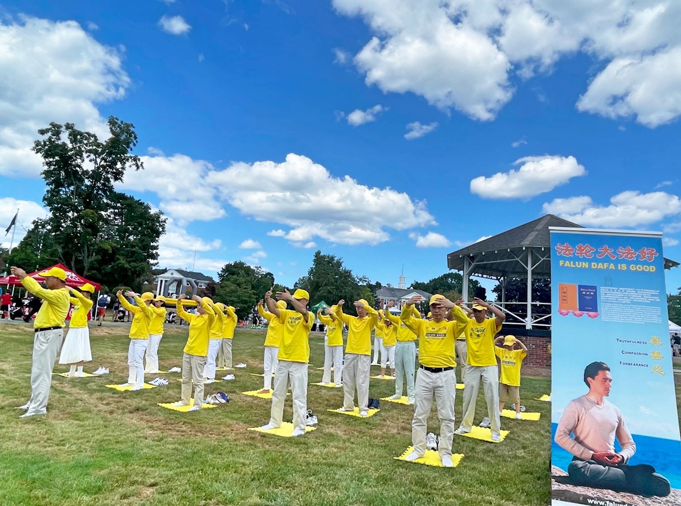 法轮功功法展示是这次主办方设立的节目之一。下午两点十五分,二十多位法轮功学员身着金黄色衣服,伴随着法轮功功法优美祥和的音乐,在市镇中心草坪上演示法轮功功法,游客纷纷驻足观看,有的坐在草坪上观看,有的坐在长椅上观看,有的跟随法轮功学员们的炼功动作模仿着炼。