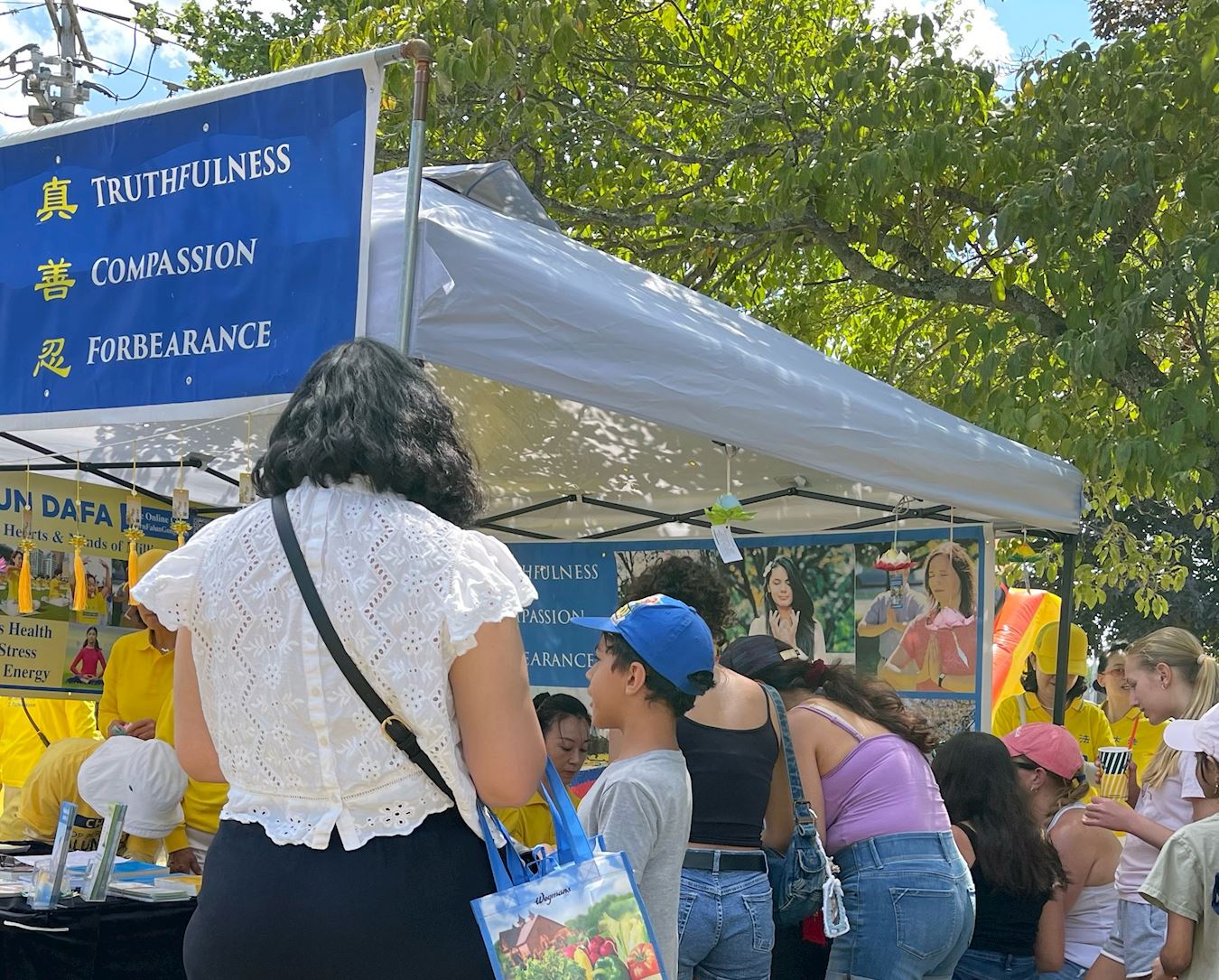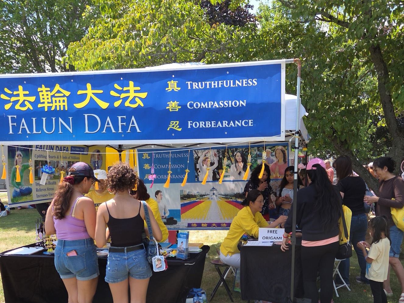 很多家长带着孩子来到法轮功展位。家长们在了解到法轮功被迫害的真相后,纷纷签名要求联邦参议院能尽速通过《法轮功保护法案》。也有人驻足了解法轮功功法特点后,在现场跟着学炼。