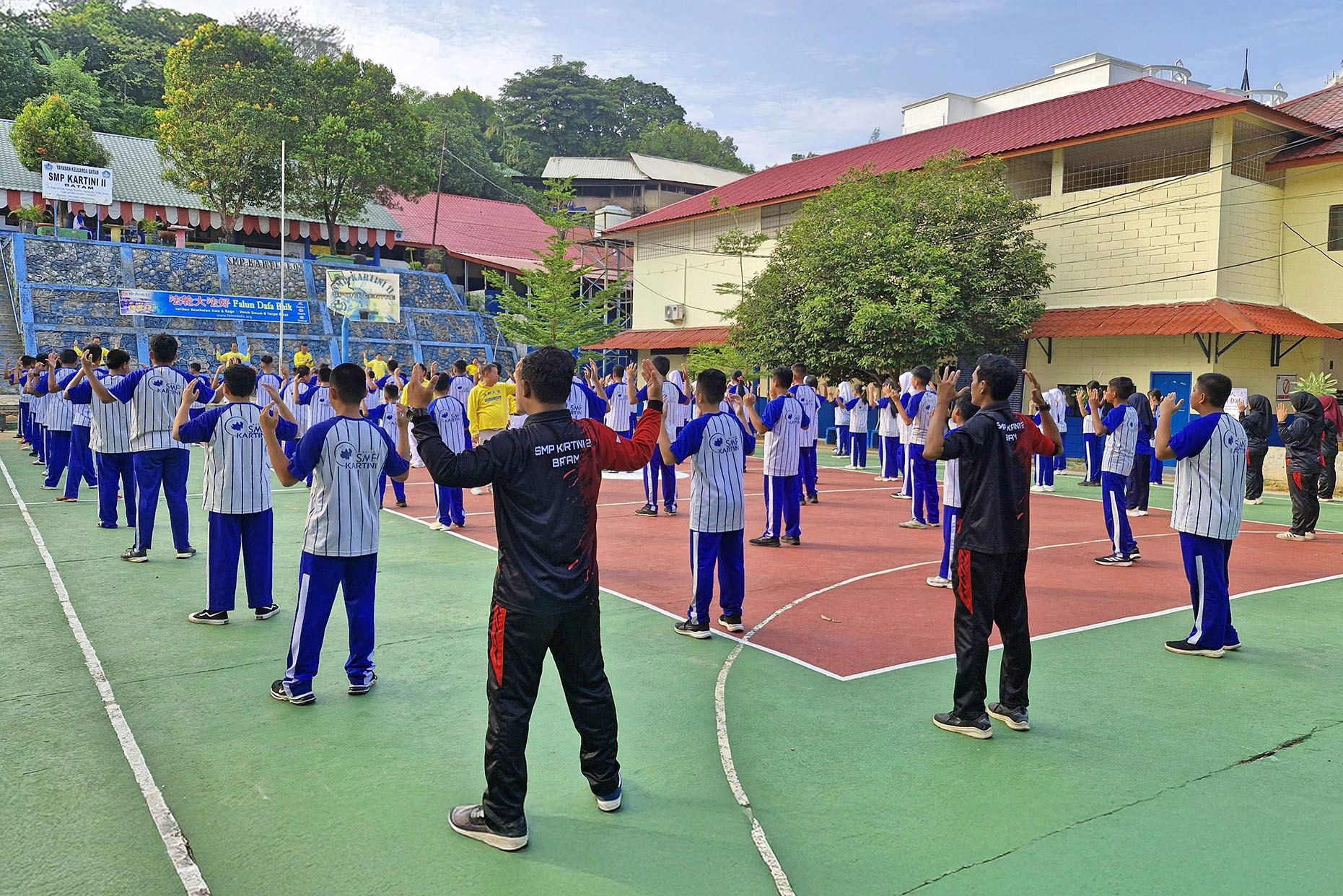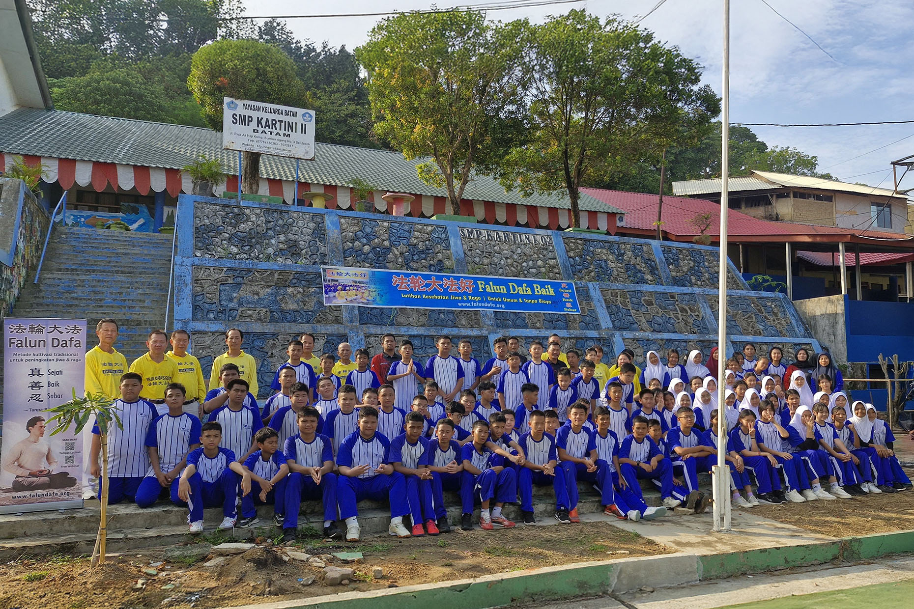 ![]() 图1~2:二零二五年八月七日,印尼巴淡岛学员在卡蒂尼第二中学举办法轮大法介绍会,上百名师生一起学炼了法轮功。 |