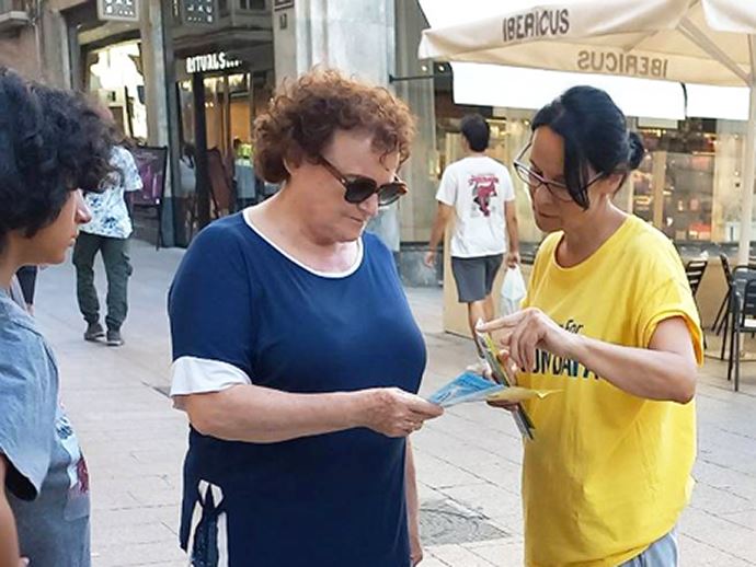 费利欧(Feliu)女士得知中国正在发生的迫害后说:“这非常令人难过。说实话,我没想到这种事会发生。感谢你们把真相告知像我这样对此一无所知的人,我们每个人都应该了解正在发生的事情。”她说她被“真、善、忍”的原则所吸引,想学炼法轮功。她在征签表上签了名,并表示会尽力把这个消息告诉她的家人和朋友们。