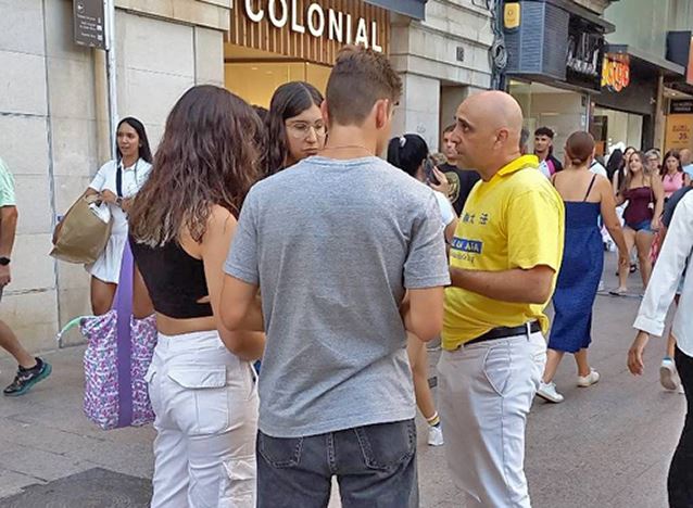 奎姆‧奥罗尼奇(Quim Oronich)第一次听说在中共对法轮功学员的迫害。他说:“我对这场迫害一无所知,我无法想象发生了如此可怕的事情。最让我震惊的是,他们(法轮功学员)的器官在未经自己同意的情况下就被摘取。这种事绝对不该发生,这真令人难过和愤怒。”他与学员交谈许久。在征签表上签名后,他离开时带走了一些真相资料,他表示,会把这个消息分享给亲朋好友,让更多的人了解真相。
