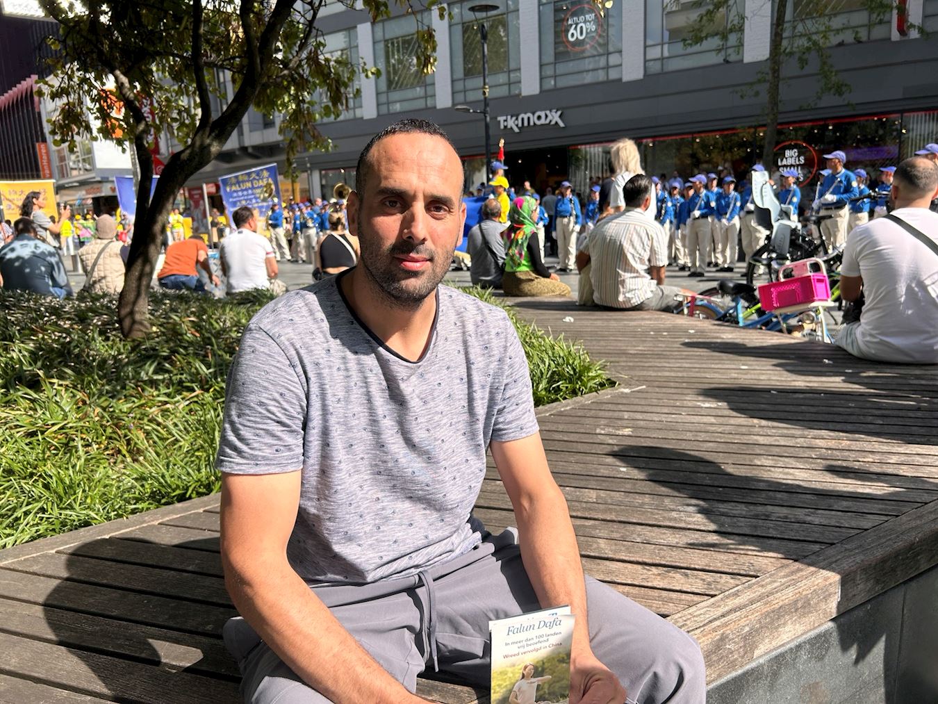 诺芬(Noven)是来自摩洛哥的青年,当游行队伍停下来天国乐团开始演奏时,他静静的坐在那里欣赏。他说自己从上午就开始追随着游行队伍,不知道为什么,就感觉跟他们在一起很美好,听了学员给他讲的法轮功学员在中国遭受的迫害后,他说:“以前我并不知道发生的这一切,每个人都应该享有自由,希望你们能摆脱压迫。听了这些音乐,我觉得很舒服,我会继续关注法轮功,希望你们(反迫害)成功!”