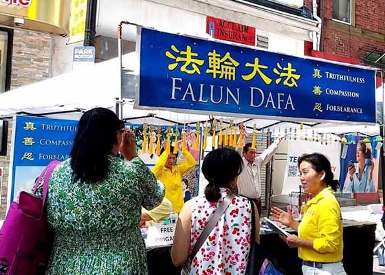 八月十三日,纽约部分法轮功学员参加了在首府奥本尼的帝国大厦广场举办的纽约州美食节活动。学员设立展位,吸引许多人驻足了解法轮功。