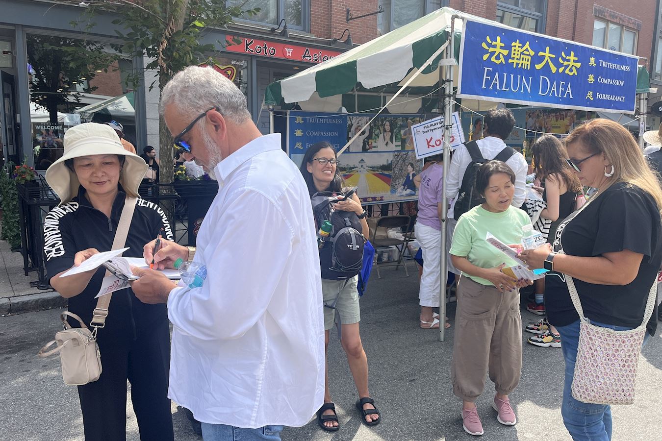 还有一对年轻人,来到展位主动询问学员在做什么?听了真相后,他们表示很遗憾不能在麻州做征签,因为他们两个都是来美国读书的留学生。但是他们很支持反迫害,对修炼很感兴趣。他们问了很多关于修炼的问题,过程中学员告诉他们很多高学历的人在大法中得到了人生问题的解答。他们高兴地拿了大法网站的信息后离开。