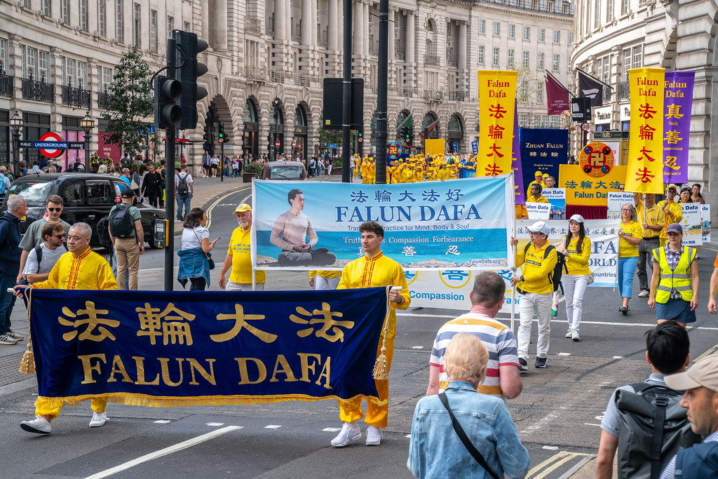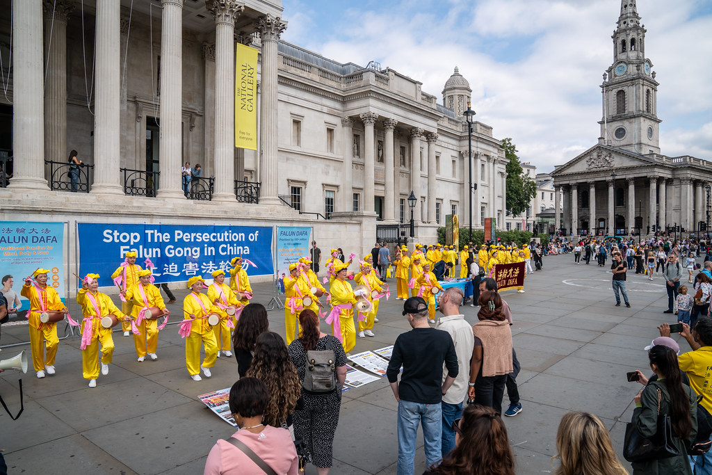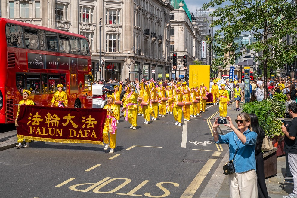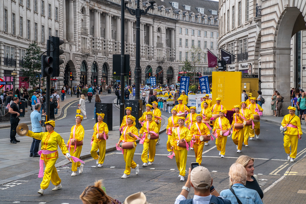 游行队伍中午十二点自中共大使馆对面启程,伴随着宁静悠扬的炼功音乐和铿锵有力的腰鼓声,穿过这座国际都会的心脏地带,途经摄政街、牛津广场、皮卡迪利广场和唐人街,并于下午一点半左右抵达特拉法加广场。