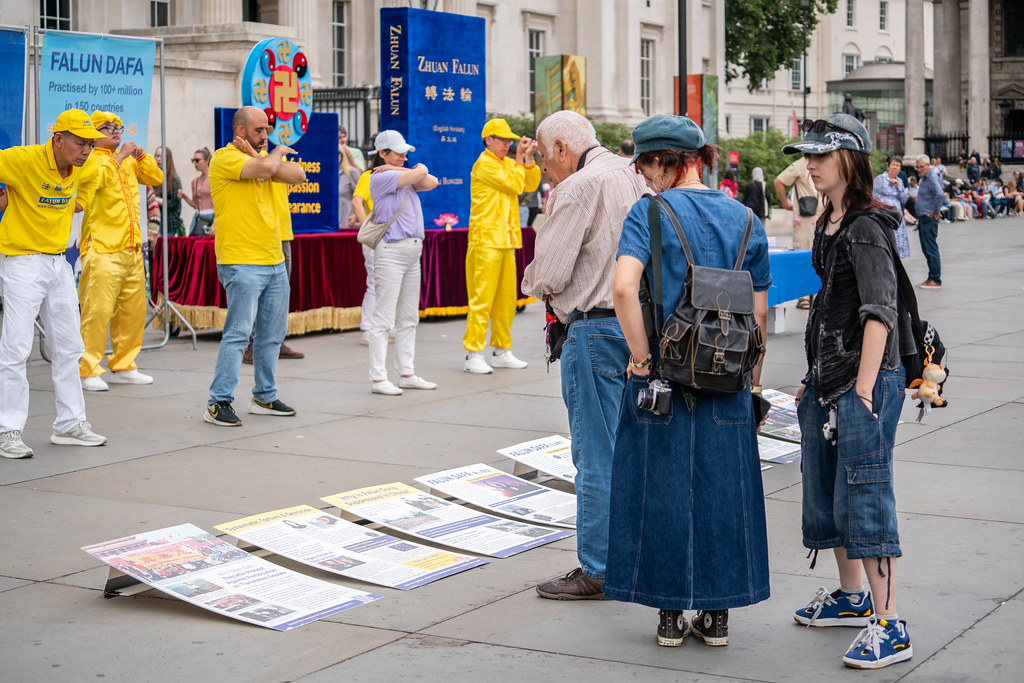 ![]() 图11~14:法轮功学员游行队伍来到特拉法加广场,举行功法演示和讲真相活动。很多民众驻足关注,并表达对法轮功学员的支持。 |