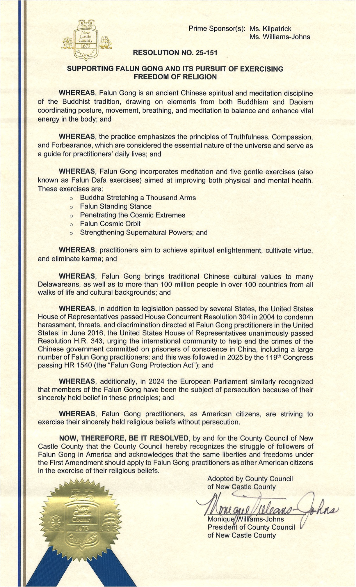 名为“支持法轮功及其追求信仰自由”的R25-151号决议由县议员珍妮特·基尔帕特里克(Janet Kilpatrick)和县议会议长莫妮克·威廉姆斯-约翰斯(Monique Williams-Johns)共同发起。