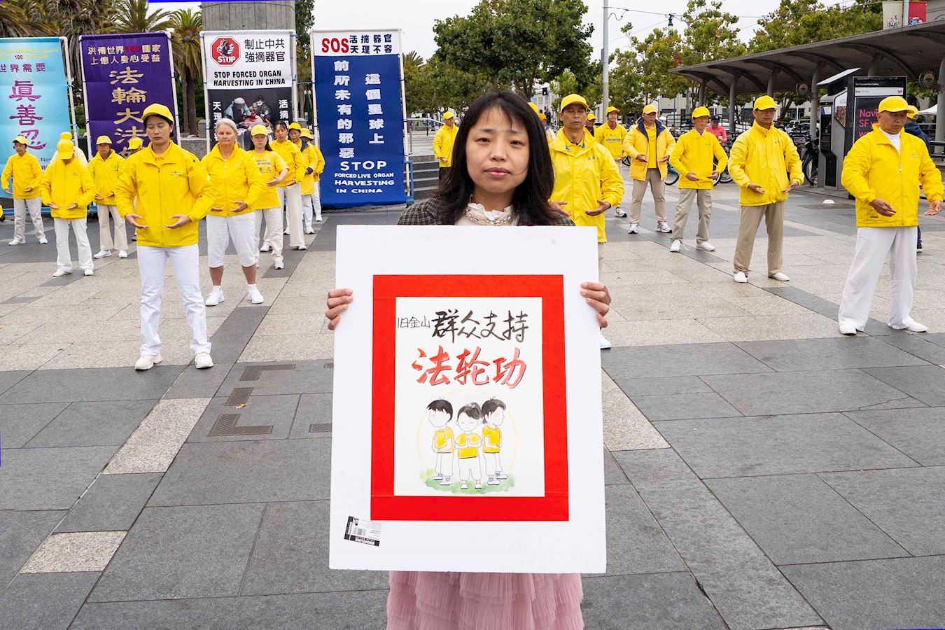 旧金山街头艺术家李科女士听说法轮功学员当天有集会,特地赶来声援。她拿着写有“旧金山民众支持法轮功”的展版说:“为了表达我的诚意,我就画了一个图,做个牌子支持你们。”