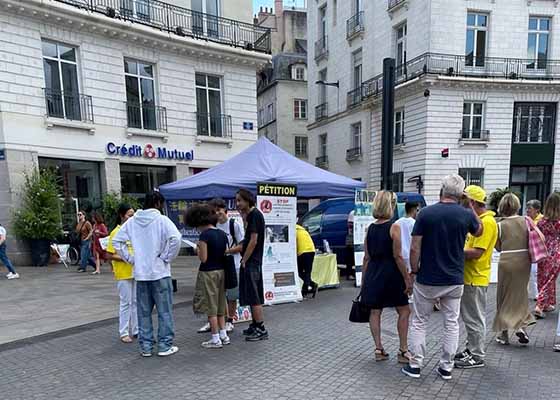 法国西部的法轮功学员八月二日在南特举办了信息日活动。他们在皇家广场搭起信息台,悬挂横幅,摆放展板,分发资讯传单,征集请愿签名。