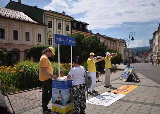 7月25日至8月1日,斯洛伐克法轮功学员在中部和西部多个城市举行了讲真相和征签活动。活动期间他们展示五套功法,与当地民众交谈。