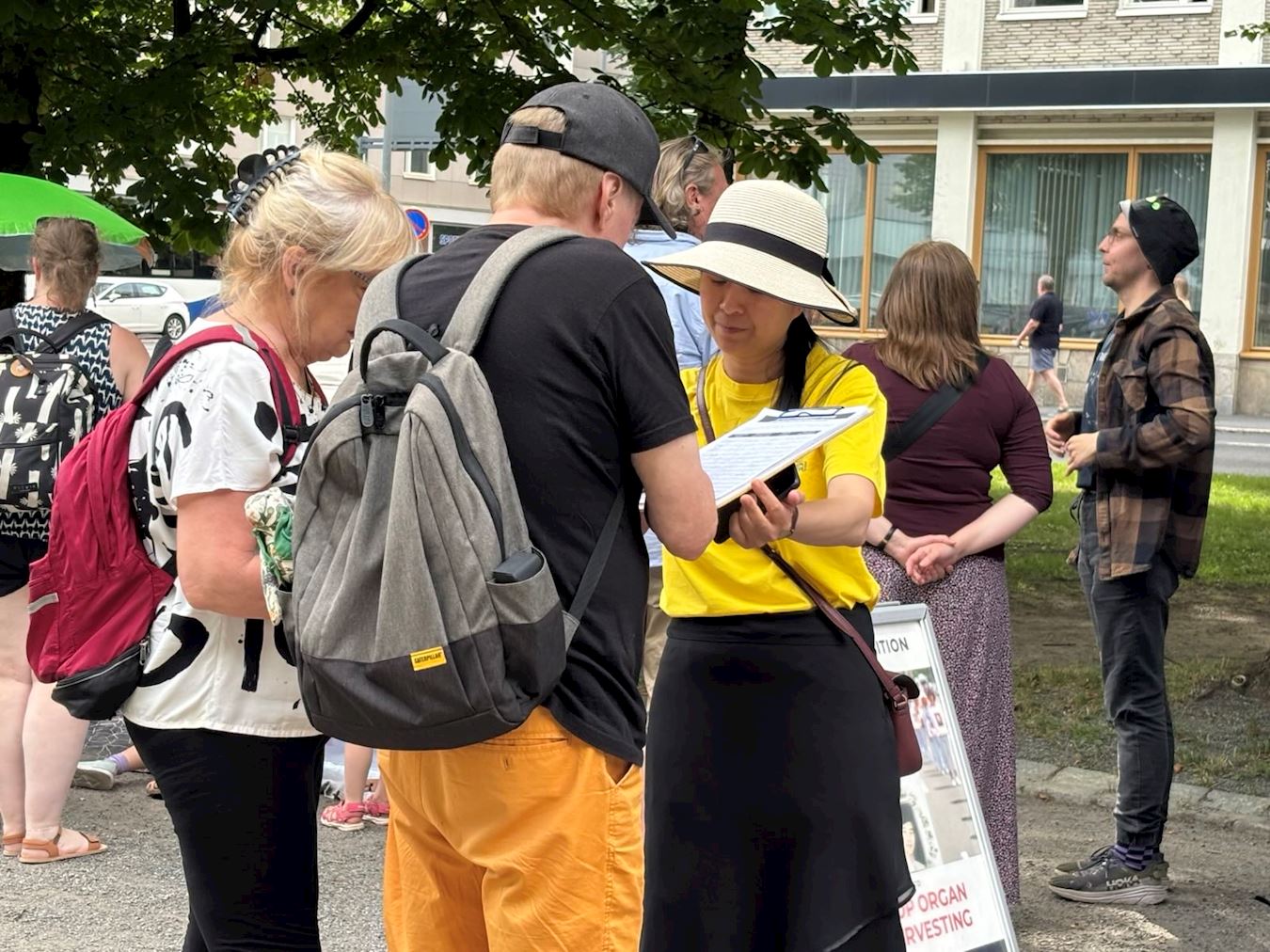 很多年轻人对法轮大法表现出兴趣,认真听学员讲解法轮功真相。了解真相后,当场签署请愿书,呼吁早日结束这场已经持续二十六年的残酷迫害。