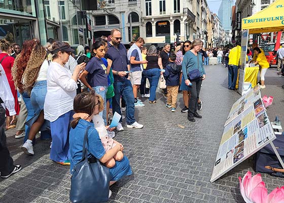 九月八日,布鲁塞尔市中心商业街行人如织。法轮功学员展示祥和的五套功法,揭露中共活摘器官等真相展板和横幅,吸引了很多市民。