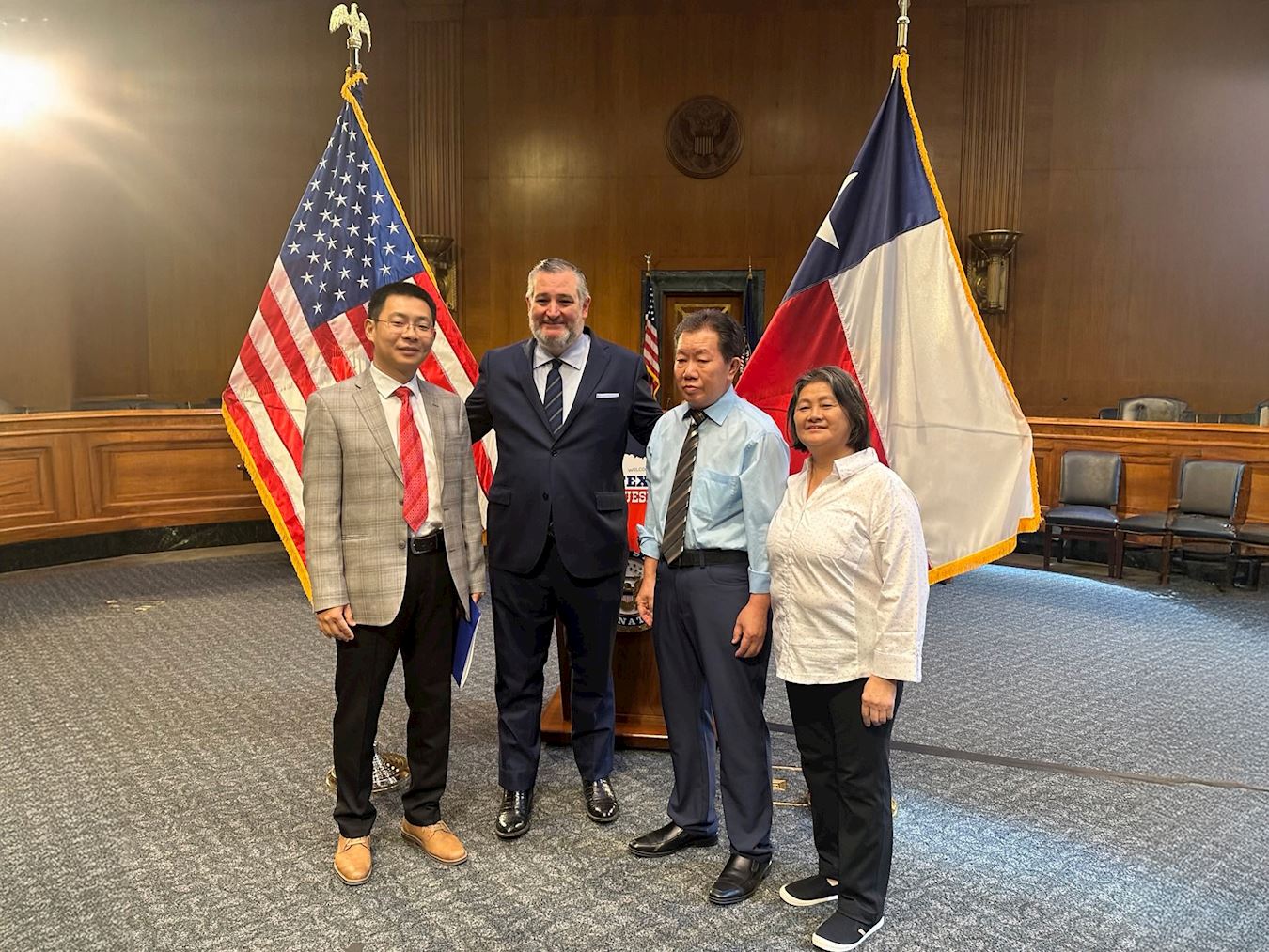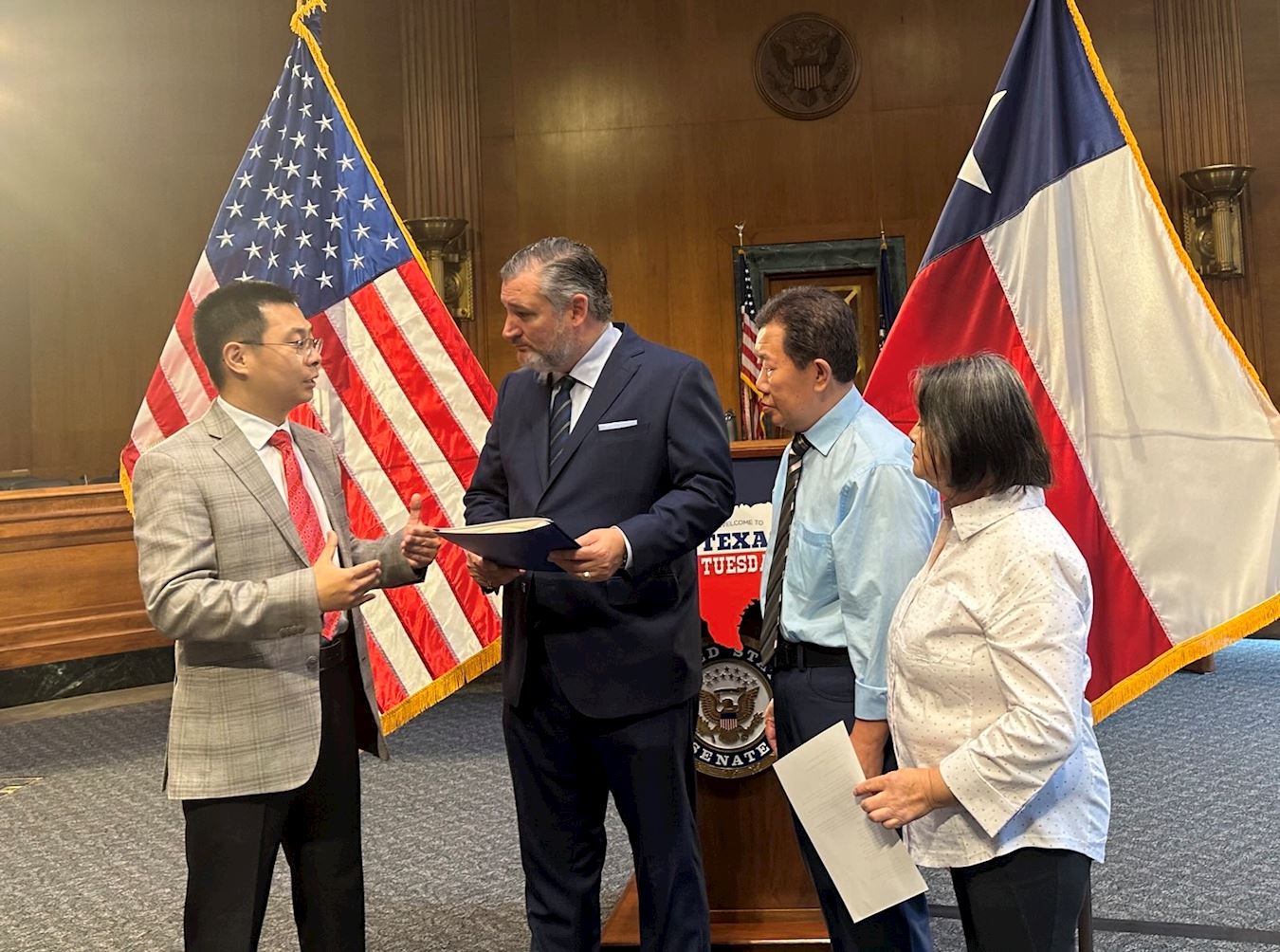九月十六日上午九点半,泰德·克鲁兹参议员在美国参议院德克森办公楼举办咖啡见面会(coffee hour)。咖啡见面会是国会常见的一种小型聚会,议员们可以在轻松的环境下和选民面对面交流问题,听取意见。在政府部门任审计师的德州法轮功学员宇昊等在见面会上将这十封来自德州议员的支持和感谢信递交给了克鲁兹参议员。