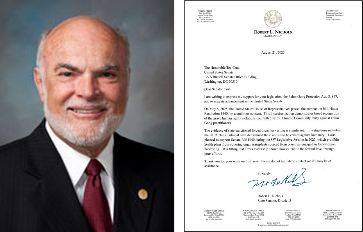 德州参议院交通委员会主席、第三选区资深共和党参议员罗伯特·尼科尔斯(Robert L. Nichols)自二零零七年以来已连任九届德州参议员。他在写给克鲁兹参议员的感谢信中说:“我写信以表达对您所提出的《法轮功保护法案》(S.817)的支持,并敦促法案在美国参议院推进。”
